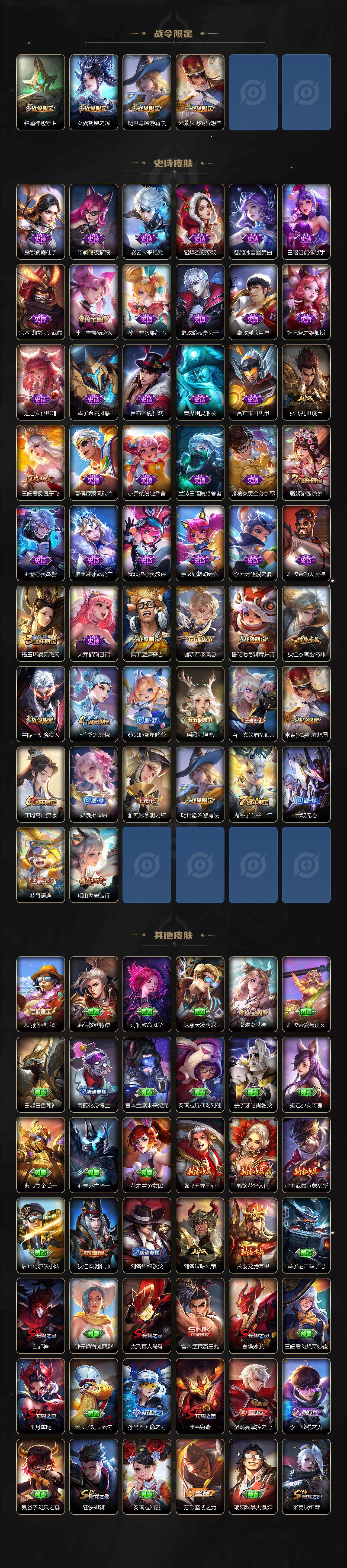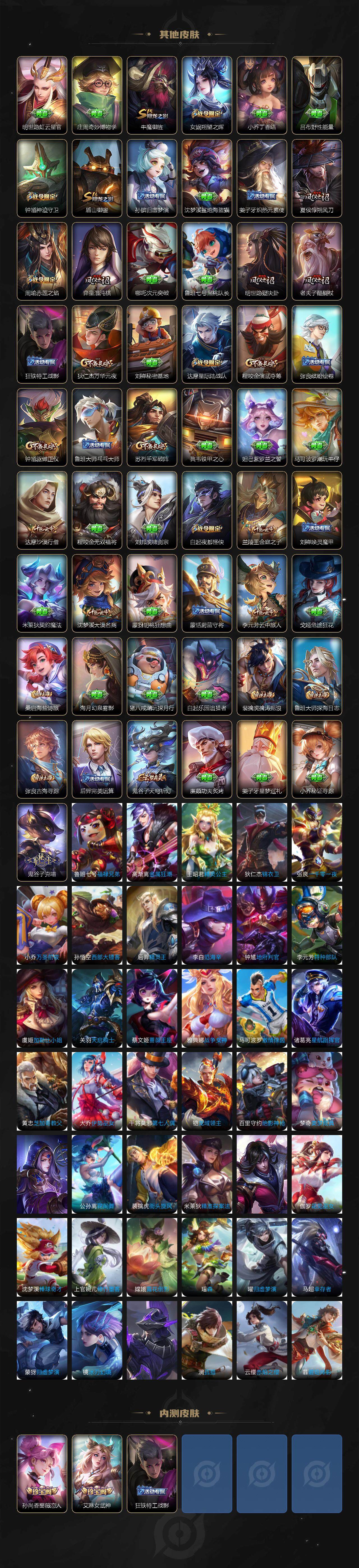 【限定皮肤】:白起狰,狄仁杰阴阳师,孙尚香蔷薇恋人,鲁班七号狮舞东方,鲁班七号寅虎瑞焰,庄周高山流水,白起夜都怪侠,芈月重明,周瑜赤莲之焰,元歌无心,夏侯惇朔风刀,甄姬游园惊梦,曹操烛龙,典韦穷奇,典韦蓝屏警告,狄仁杰万华元夜,达摩星际陆战队,达摩沙漠行僧,项羽海滩派对,老夫子醍醐杖,程咬金演武夺筹,王昭君凤凰于飞,兰陵王驯魔猎人,兰陵王金庭之子,牛魔御旌,李元芳云中旅人,钟馗神迹守卫,钟馗驱傩正仪,杨玉环遇见飞天,女娲朔望之晖,雅典娜黎明之约,蔡文姬繁星吟游,太乙真人饕餮,鬼谷子五谷丰年,苏烈千军破阵,百里玄策原初追逐者,弈星混沌棋,梦奇顽趣,沈梦溪大漠名商,明世隐疑决卦,明世隐吟游魔法,裴擒虎擒涛扼浪,狂铁御狮,米莱狄御霄,米莱狄胡桃异想国,瑶山海碧波行,盾山御銮,上官婉儿梁祝,嫦娥拒霜思,鲁班大师探海日志,桑启海盐诗旅,艾琳女武神,张良古海寻踪,鬼谷子天穹祈灯