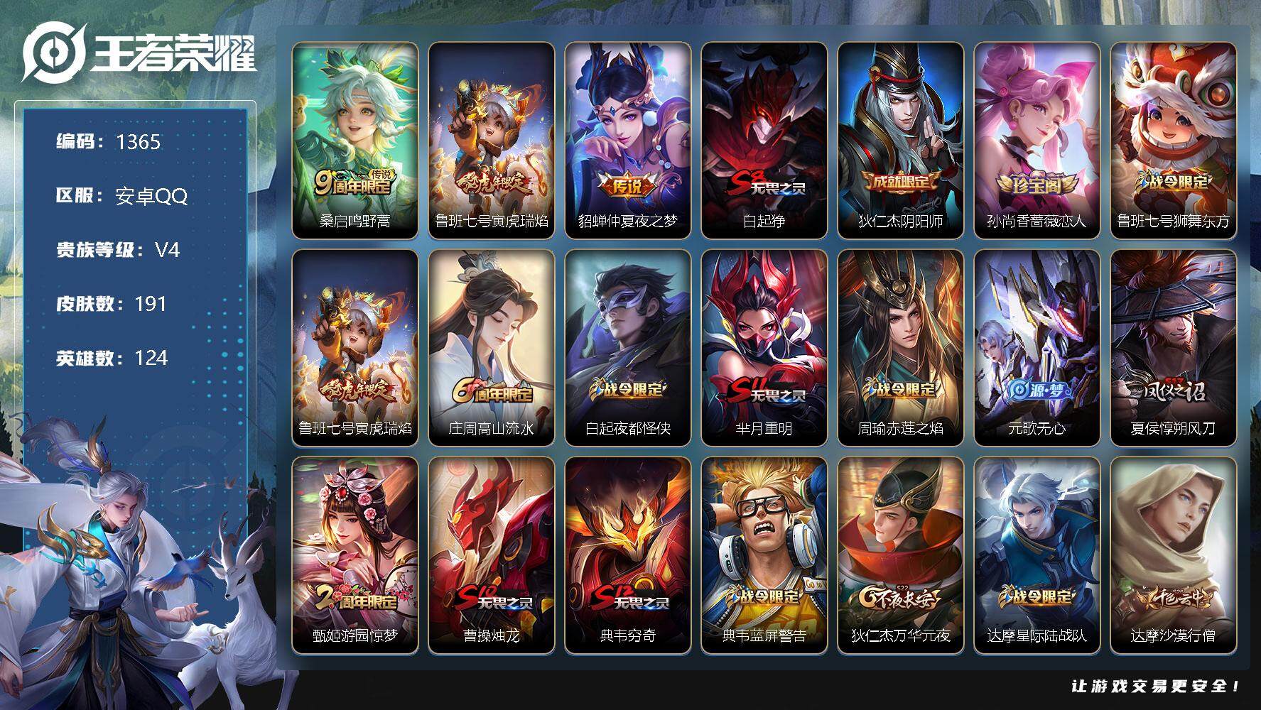 [11489429]【商品标题】:安卓Q-V4-尊贵铂金I段位-124英雄-191皮肤-0典藏-0珍品无双-0无双-0珍品传说-3传说-50史诗 【传说皮肤】:桑启鸣野蒿,鲁班七号寅虎瑞焰,貂蝉仲夏夜之梦 【限定皮肤】:白起狰,狄仁杰阴阳师,孙尚香蔷薇恋人,鲁班七号狮舞东方,鲁班七号寅虎瑞焰,庄周高山流水,白起夜都怪侠,芈月重明,周瑜赤莲之焰,元歌无心,夏侯惇朔风刀,甄姬游园惊梦,曹操烛龙,典韦穷奇,典韦蓝屏警告,狄仁杰万华元夜,达摩星际陆战队,达摩沙漠行僧,项羽海滩派对,老夫子醍醐杖,程咬金演武夺筹,王昭君凤凰于飞,兰陵王驯魔猎人,兰陵王金庭之子,牛魔御旌,李元芳云中旅人,钟馗神迹守卫,钟馗驱傩正仪,杨玉环遇见飞天,女娲朔望之晖,雅典娜黎明之约,蔡文姬繁星吟游,太乙真人饕餮,鬼谷子五谷丰年,苏烈千军破阵,百里玄策原初追逐者,弈星混沌棋,梦奇顽趣,沈梦溪大漠名商,明世隐疑决卦,明世隐吟游魔法,裴擒虎擒涛扼浪,狂铁御狮,米莱狄御霄,米莱狄胡桃异想国,瑶山海碧波行,盾山御銮,上官婉儿梁祝,嫦娥拒霜思,鲁班大师探海日志,桑启海盐诗旅,艾琳女武神,张良古海寻踪,鬼谷子天穹祈灯 【年限皮肤】:鲁班七号寅虎瑞焰,王昭君凤凰于飞,瑶山海碧波行 【赛季限定】:白起狰,芈月重明,夏侯惇朔风刀,曹操烛龙,典韦穷奇,狄仁杰万华元夜,达摩沙漠行僧,老夫子醍醐杖,程咬金演武夺筹,兰陵王金庭之子,张良古海寻踪,牛魔御旌,李元芳云中旅人,钟馗驱傩正仪,雅典娜黎明之约,太乙真人饕餮,苏烈千军破阵,百里玄策原初追逐者,弈星混沌棋,梦奇顽趣,沈梦溪大漠名商,明世隐疑决卦,裴擒虎擒涛扼浪,狂铁御狮,米莱狄御霄,盾山御銮,鲁班大师探海日志,桑启海盐诗旅,鬼谷子天穹祈灯 【战令限定】:鲁班七号狮舞东方,白起夜都怪侠,周瑜赤莲之焰,典韦蓝屏警告,达摩星际陆战队,兰陵王驯魔猎人,钟馗神迹守卫,女娲朔望之晖,明世隐吟游魔法,米莱狄胡桃异想国 【史诗皮肤】:露娜紫霞仙子,阿轲暗夜猫娘,赵云未来纪元,貂蝉圣诞恋歌,甄姬冰雪圆舞曲,王昭君偶像歌手,宫本武藏鬼剑武藏,孙尚香蔷薇恋人,孙尚香水果甜心,嬴政暗夜贵公子,嬴政摇滚巨星,妲己魅力维加斯,妲己女仆咖啡,墨子金属风暴,吕布圣诞狂欢,曹操幽灵船长,吕布末日机甲,张飞乱世虎臣,王昭君凤凰于飞,夏侯惇乘风破浪,小乔缤纷独角兽,兰陵王暗隐猎兽者,诸葛亮黄金分割率,甄姬游园惊梦,亚瑟心灵战警,雅