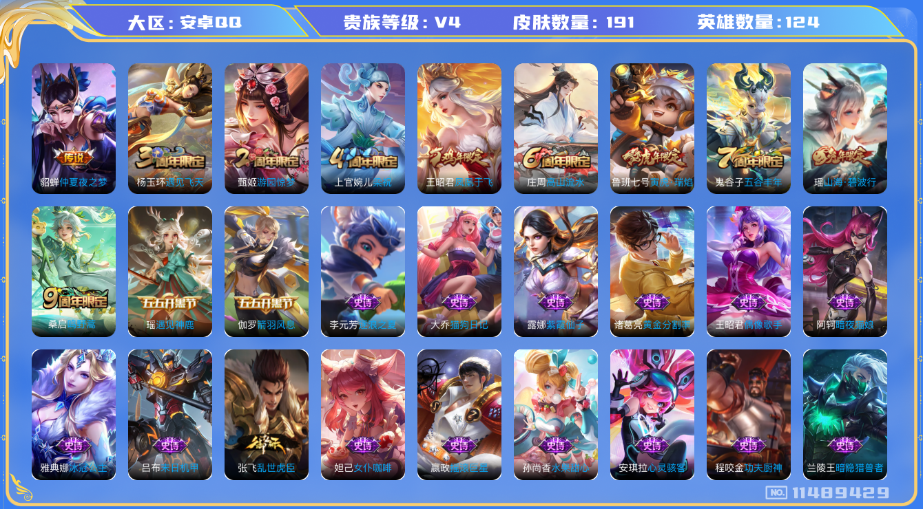 [11489429]【商品标题】:安卓Q-V4-尊贵铂金I段位-124英雄-191皮肤-0典藏-0珍品无双-0无双-0珍品传说-3传说-50史诗