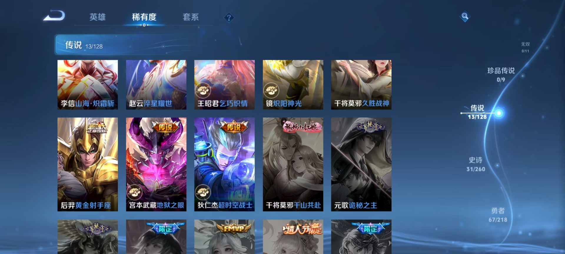- [12193665]V7 2典藏 3传说 124英雄 189皮肤 可修改实名 优质装备:杀手不太冷,全息碎影(猴子典藏),黄金狮子座,仲夏夜之梦(大飞蛾),霜月吟 珍宝阁皮:女武神,玩趣恶龙 限定皮:至尊宝,高山流水,五谷丰年,梁祝,李小龙,辉光之辰,猪悟能,引擎之心 史诗皮:茶境仙,百相守梦-黄忠,蒙犽顽岩魄,紫霞仙子,苍穹之光,电玩小子(小书包),白龙吟,特工魅影,冰冠公主,真我赫兹(百里守约),江河有灵,蒙恬荣光圣徽,电玩·爆裂旋风,末日机甲-吕布,时之恋人-孙尚香,乱世虎臣,节奏热浪,女仆咖啡,摇滚巨星,水果甜心,心灵骇客,暗隐猎兽者,鬼剑武藏,暗渊魔法,繁星吟游(呼啦呼啦),乘风破浪,逐浪之夏,水晶猎龙者,曙光守护者,箭羽风息,金属风暴,原初追逐者,圣诞狂欢,圣诞恋歌,鹰眼统帅,王者之锤,魅力维加斯