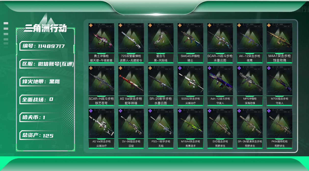 [11489717]总资产:125.2M 1干员外观 10传说枪械 哈夫币:1.356K 高级安全箱(2×3)9.15号到期 可二次 可修改实名 烽火地带段位:黑鹰 全面战场段位:军士长 传说武器皮肤:SR-25射手步枪-水墨云图,SCAR-H战斗步枪-水墨云图,AS Val突击步枪-蛇年祥瑞,SCAR-H战斗步枪-铁艺苍穹,SMG45冲锋枪-骑士,勇士冲锋枪-能天使-午夜邮差,复合弓-黑-天际线,725双管霰弹枪-送葬人-无题密令,AK-12突击步枪-夜鹰,M4A1突击步枪-蚀金玫瑰 史诗武器皮肤:Ash-12战斗步枪-守夜人,M16A4突击步枪-竞赛选手,AS Val突击步枪-尖端治疗,M700狙击步枪-守夜人,SG552突击步枪-尖端治疗,MP5冲锋枪-深海恐惧,PKM通用机枪-荒野求生,SV-98狙击步枪-囚徒,PSG-1射手步枪-无垢,SVD狙击步枪-荒野求生,SR-3M紧凑突击步枪-荒野求生 干员外观:红狼-蚀金玫瑰