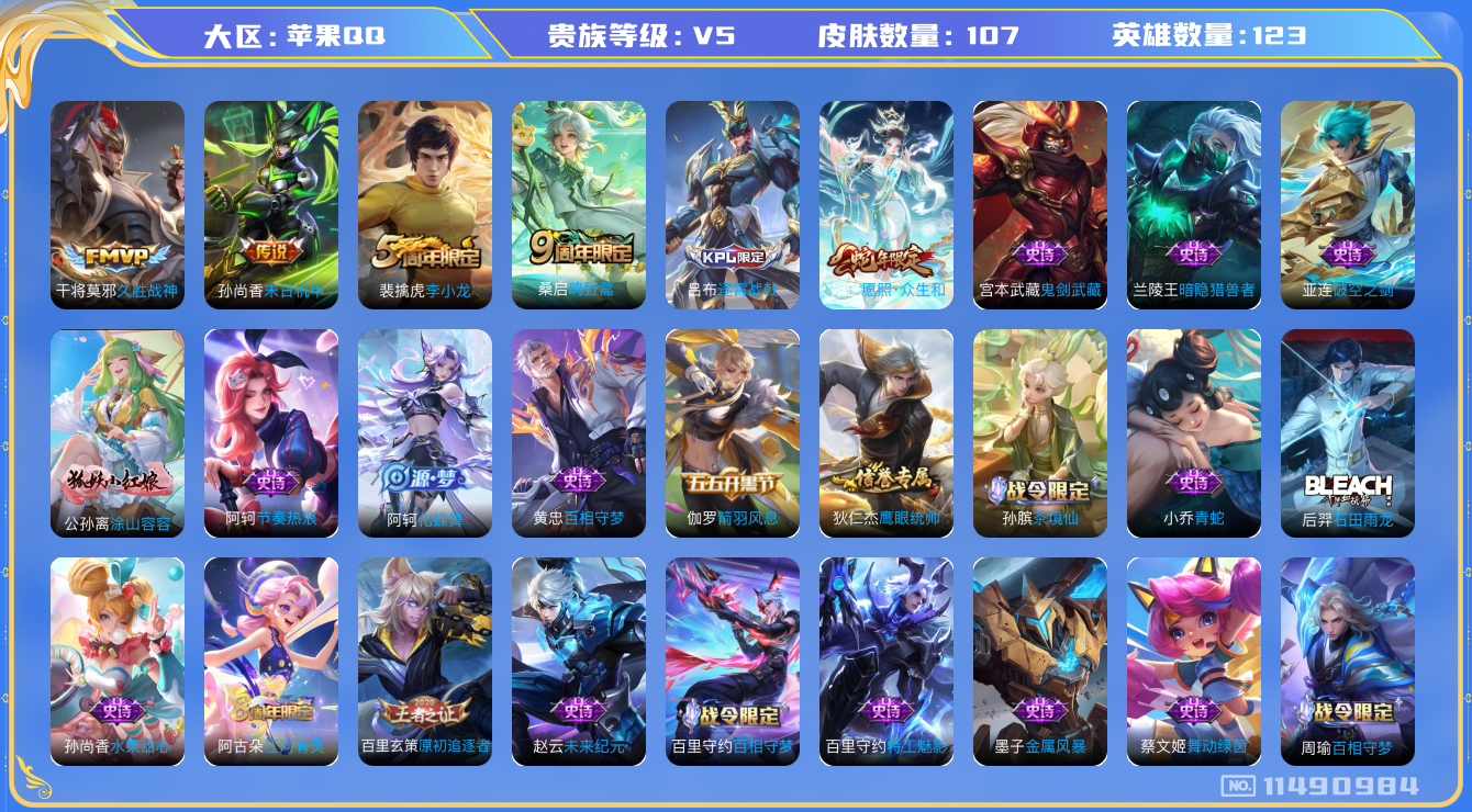 [11490984]V5 4传说 123英雄 107皮肤 可修改实名 优质装备:久胜战神,末日机甲-孙尚香(绿蚂蚱),涂山容容 限定皮:愿照·众生和(妲己年限),逐霄战戟,鸣野蒿,李小龙 史诗皮:鸭鸭历险记-刘禅,化蝶舞,石田雨龙,百相守梦-周瑜,茶境仙,破空之剑,百相守梦-百里守约,百相守梦-黄忠,特工魅影,江河有灵,青蛇,节奏热浪,水果甜心,绅士熊喵,暗隐猎兽者,鬼剑武藏,舞动绿茵,箭羽风息,金属风暴,原初追逐者,鹰眼统帅,魅力维加斯,未来纪元-赵云
