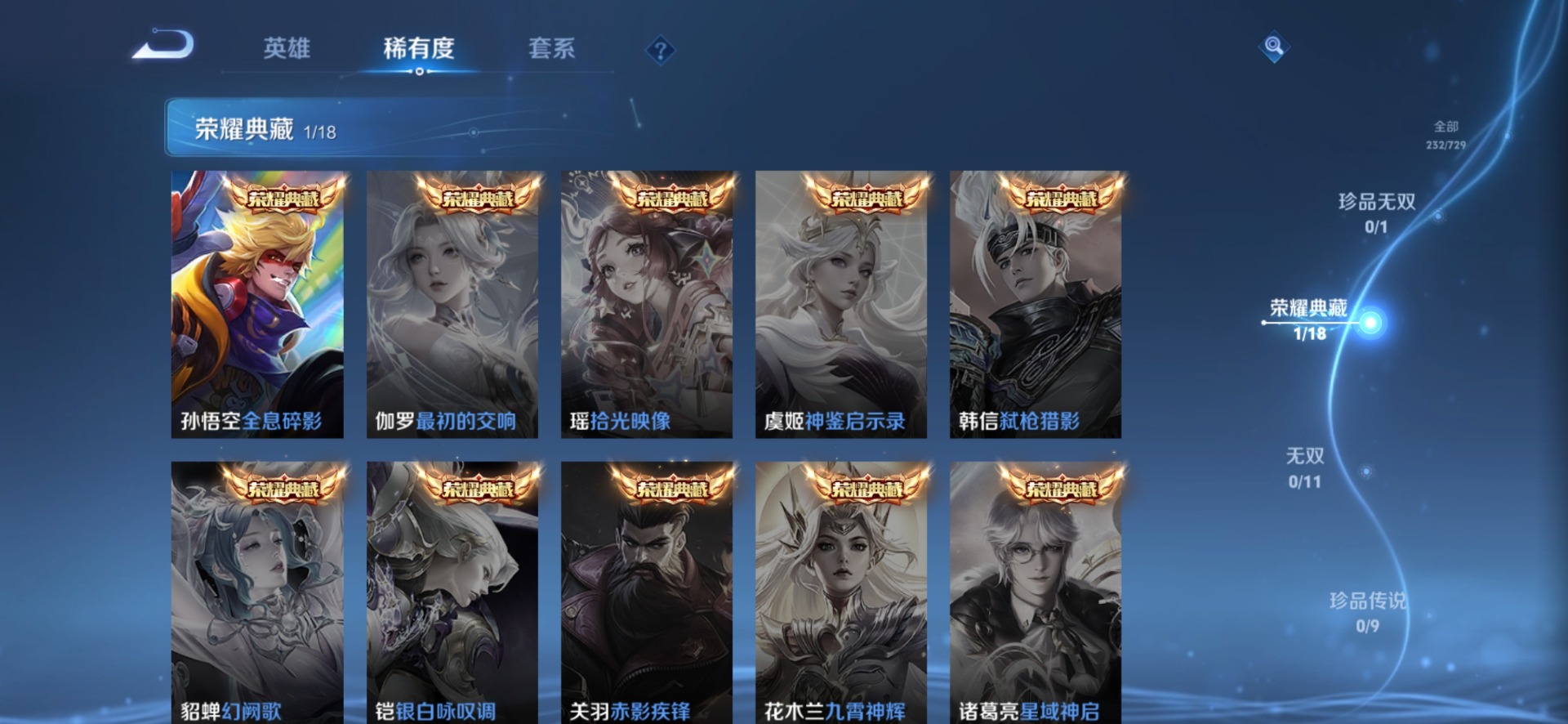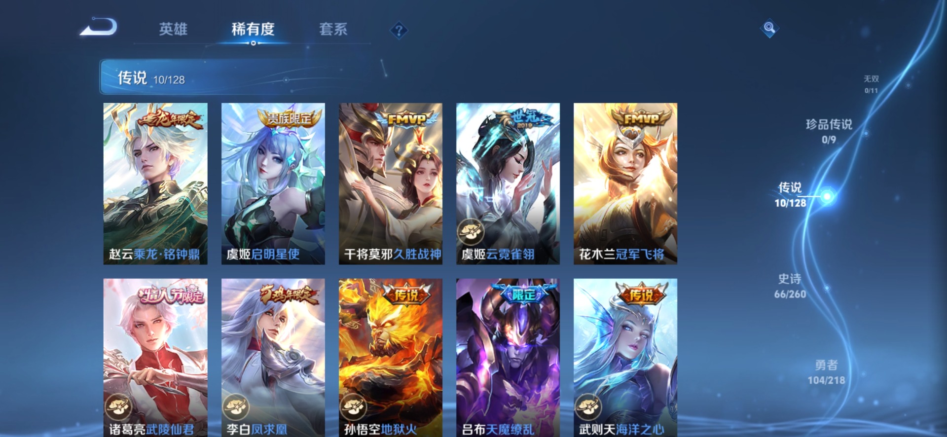 铠青龙志,干将莫邪冰霜恋舞曲,后羿如梦令,露娜一生所爱,公孙离蜜橘之夏,裴擒虎李小龙,裴擒虎天狼狩猎者,东皇太一逐梦之光,花木兰青春决赛季,孙悟空大圣娶亲,孙悟空至尊宝,马超神威,关羽冰锋战神