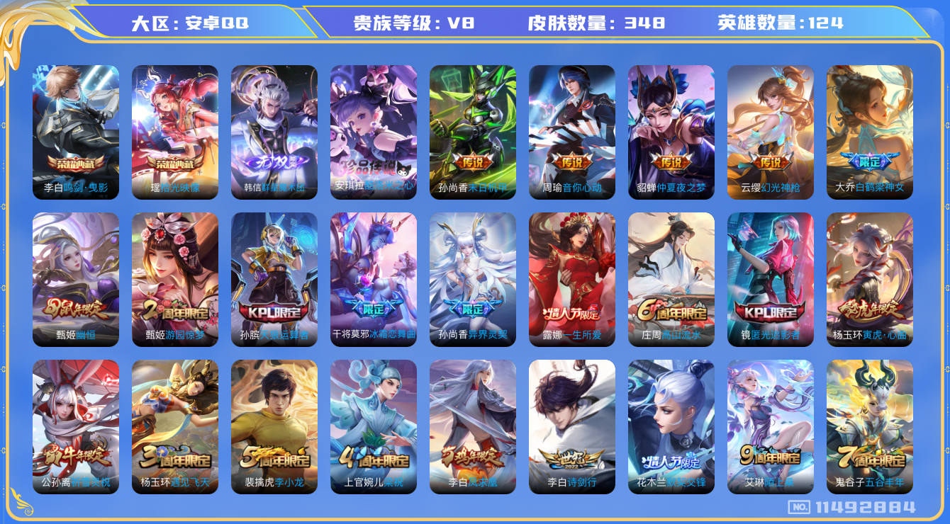 [11492884]V8 2典藏 1无双 1珍品传说 13传说 124英雄 348皮肤 可修改实名 优质装备:鸣剑·曳影,韩信群星魔术团(韩信无双),拾光映像(瑶典藏),酷洛米之心,末日机甲-孙尚香(绿蚂蚱),仲夏夜之梦(大飞蛾),音你心动-周瑜,涂山容容 传说皮:幻光神枪 珍宝阁皮:优雅恋人,蔷薇恋人,女武神 限定皮:愿照·福禄聚(蔡文姬年限),愿照·岁时盈(虞姬年限),陌上桑,鸣野蒿,凤求凰(白切鸡),异界灵契(白毛香),星穹之声,白鹤梁神女,遇见飞天,高山流水,诗剑行,五谷丰年,幽恒(沐浴露),天狼运算者,游园惊梦,梁祝,祈雪灵祝(雪兔子),李小龙,逐梦之影,如梦令-嫦娥,默契交锋-花木兰,一生所爱,冰霜恋舞曲,匿光追影者,寅虎·心曲(虎婆) 史诗皮:化蝶舞,灵蛊蚀心,星界战将,龙之律动,茶境仙,蒙犽顽岩魄,百相守梦-黄忠,织梦人,遇见神鹿,紫霞仙子,苍穹之光,电玩小子(小书包),黄金分割率,特工魅影,千年之狐,蒙恬荣光圣徽,冰冠公主,偶像歌手,白蛇,晚萤,电玩·爆裂旋风,暗夜猫娘,龙骑士(小龙虾),末日机甲-吕布,猫狗日记-孙策,猫狗日记-大乔,乱世虎臣,节奏热浪,修罗,女仆咖啡,摇滚巨星,水果甜心,绅士熊喵,天才门将,星夜王子,心灵骇客,时之奇旅-安琪拉,功夫厨神,德古拉伯爵,暗隐猎兽者,幽灵船长,鬼剑武藏,心灵战警,舞动绿茵,地狱岩魂,诗语江南,繁星吟游(呼啦呼啦),拒霜思,缤纷独角兽,乘风破浪,逐浪之夏,水晶猎龙者,曙光守护者,箭羽风息,金属风暴,原初追逐者,圣诞狂欢,圣诞恋歌,鹰眼统帅,暗夜贵公子,黎明之约,未来纪元-赵云