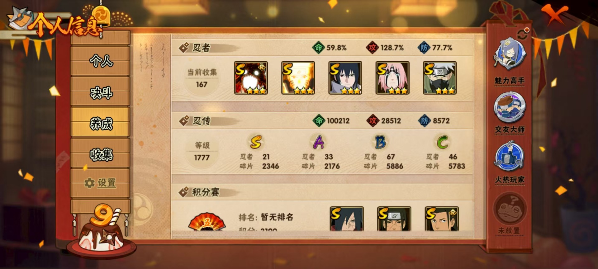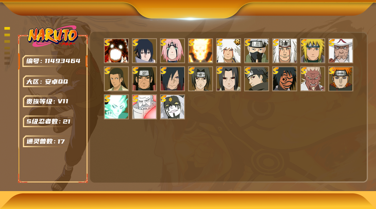 [11493464]V11 21S忍 30A忍 17通灵 735W战力 可二次 可修改实名 优质装备:千手柱间「秽土转生」,宇智波鼬「秽土转生」,漩涡鸣人 「九喇嘛连结」,大筒木金式「博人传」,春野樱 「忍界大战」,神秘面具男 「红夜之刃」,宇智波佐助「永恒万花筒」,千手柱间·木叶创立,宇智波斑「秽土转生·解」,大筒木桃式,艾「忍界大战」,宇智波止水「须佐能乎」,旗木卡卡西「须佐能乎」,大筒木舍人 「最终章」,漩涡鸣人 「暴怒·第六尾」 S级忍者:自来也 「舞之豪杰」,宇智波鼬 「须佐能乎」,佩恩「天道」,猿飞日斩,波风水门,自来也