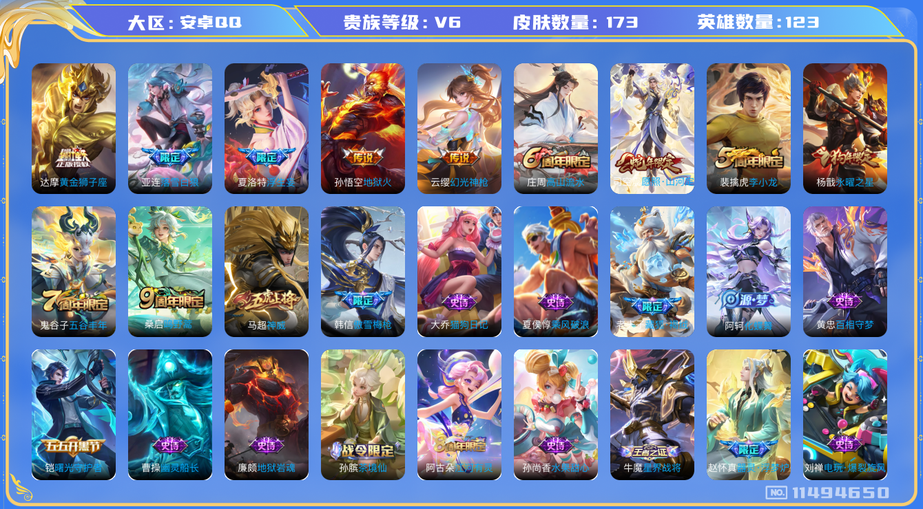 [11494650]V6 8传说 123英雄 173皮肤 可修改实名 优质装备:黄金狮子座,地狱火,浮生妄,涂山容容 传说皮:落雪白狼,幻光神枪 珍宝阁皮:胡桃夹子,玩趣恶龙 限定皮:愿照·山河定(司空震年限),鸣野蒿,傲雪梅枪,神威(电光马子),高山流水,五谷丰年,李小龙,永曜之星 史诗皮:器灵·浮梦炉,糖绘人间,化蝶舞,星界战将,龙之律动,藏狐·褐绒,茶境仙,破空之剑,东方月初,百相守梦-黄忠,江河有灵,蒙恬荣光圣徽,偶像歌手,电玩·爆裂旋风,猫狗日记-大乔,女仆咖啡,水果甜心,绅士熊喵,星夜王子,暗隐猎兽者,幽灵船长,鬼剑武藏,心灵战警,地狱岩魂,乘风破浪,水晶猎龙者,曙光守护者,金属风暴,原初追逐者,圣诞恋歌,鹰眼统帅,魅力维加斯,赏金猎手,无心,未来纪元-赵云