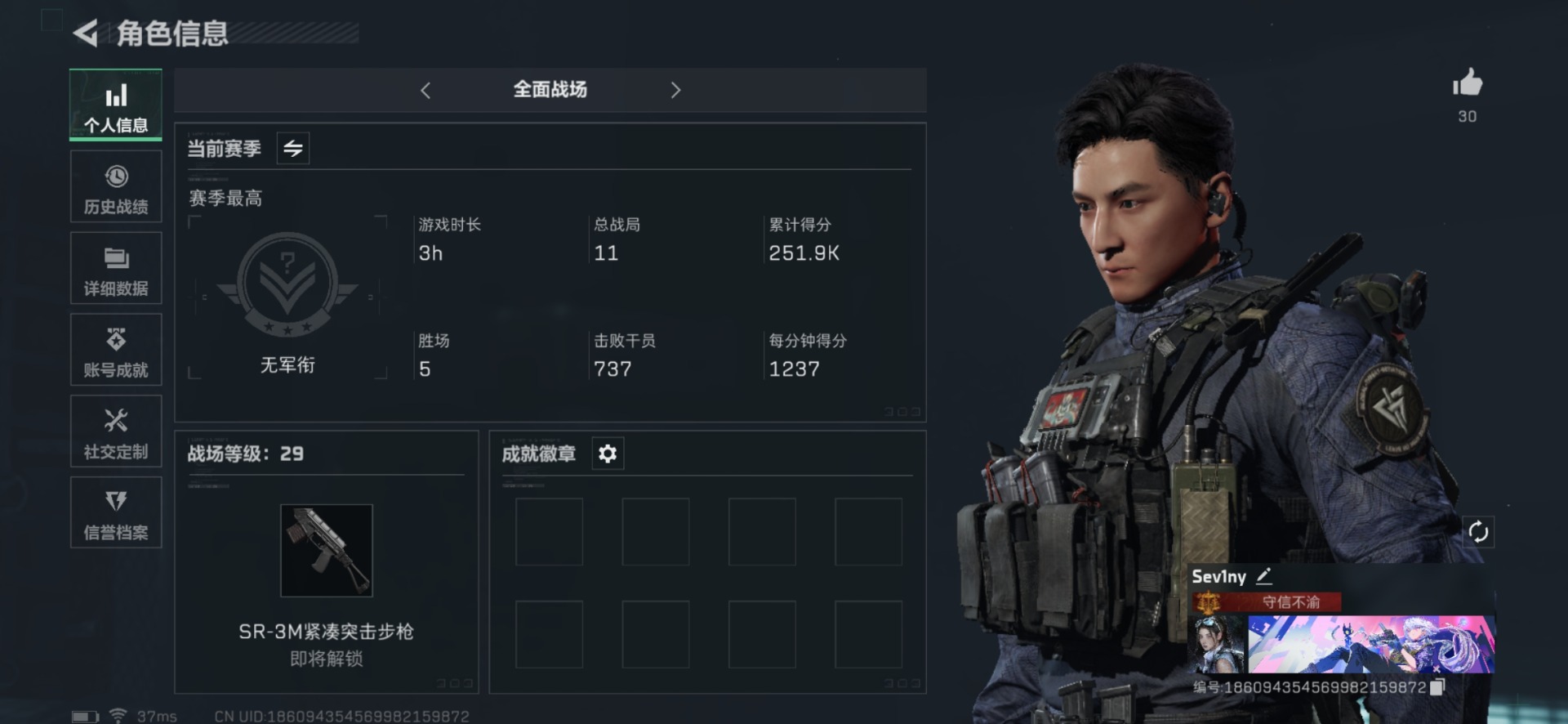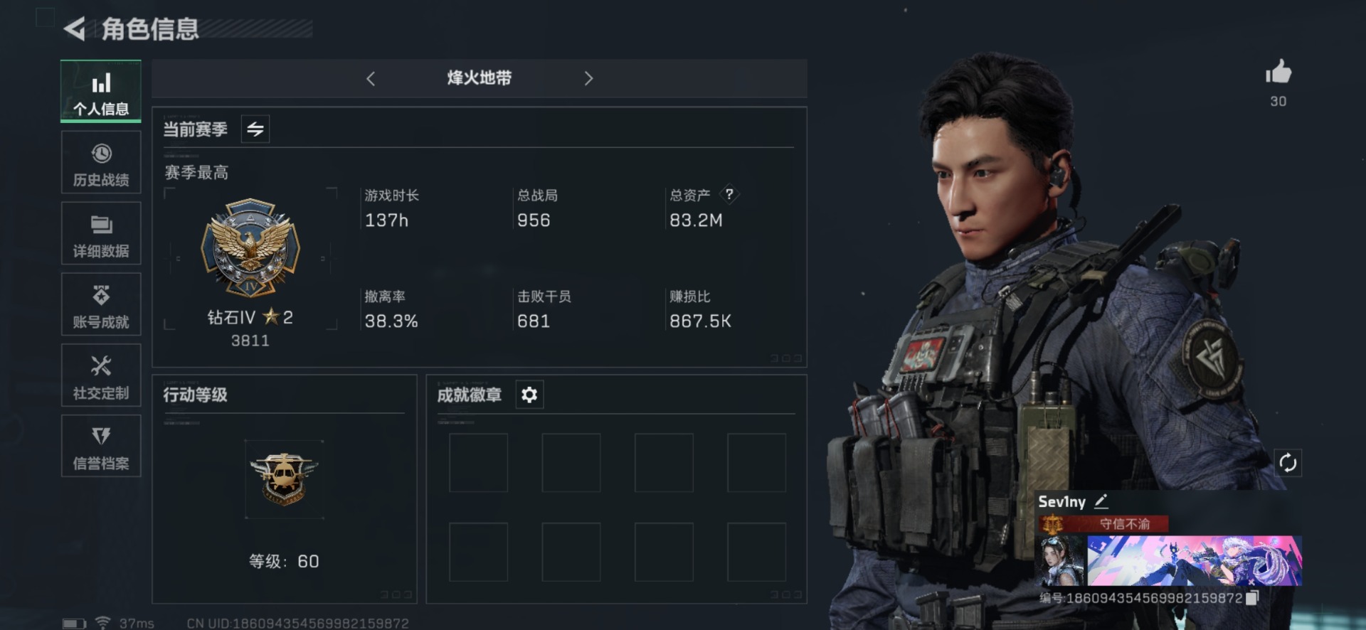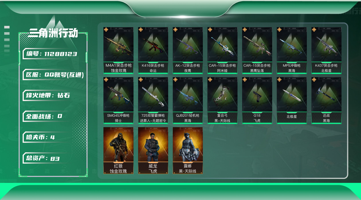[11288123]总资产:83.2 3干员外观 2近战传说 14传说枪械 高级安全箱(2×3)9.15号到期 段位:无段位 可二次 可修改实名 烽火地带段位:钻石 全面战场段位:无段位 哈夫币:4.119 传说武器皮肤:近战-黑海,近战-北极星,K416突击步枪-命运(典藏),AK-12突击步枪-夜鹰,SMG45冲锋枪-骑士,QJB201轻机枪-黑海,MP5冲锋枪-黑海,复合弓-黑-天际线,CAR-15突击步枪-阿米娅,725双管霰弹枪-送葬人-无题密令,K437突击步枪-北极星,G18-飞虎,M4A1突击步枪-蚀金玫瑰,CAR-15突击步枪-黑鹰坠落 干员外观:红狼-蚀金玫瑰,威龙-飞虎,露娜-黑·天际线
