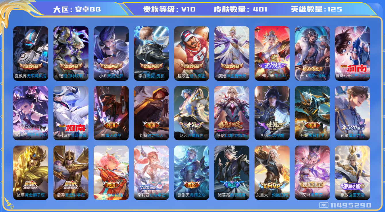 - [12090369]V10 7典藏 1珍品无双 5无双 6珍品传说 88传说 126英雄 570皮肤 典藏英雄武则天 可修改实名 优质装备:馥梦繁花,天鹅之梦(小乔典藏),倪克斯神谕(宇宙婆娘),九霄神辉(木兰典藏),赤影疾锋,幻阙歌(貂蝉典藏),青丘·九尾(妲己无双),韩信群星魔术团(韩信无双),花合斗,离恨烟(公孙离无双),拾光映像(瑶典藏),雪境奇遇-甄姬,最初的交响(伽罗典藏),怪盗基德,器灵·落星盏,酷洛米之心,大耳狗之梦,朽木白哉,黑崎一护,黄金狮子座,黄金射手座,冠军飞将,云鹰飞将(小将军),绛天战甲(鸡嘴战神),黄金白羊座,猫影幻舞,久胜战神,炽阳神光,一念神魔,云霓雀翎,末日机甲-孙尚香(绿蚂蚱),地狱火,仲夏夜之梦(大飞蛾),音你心动-小乔,零号·赤焰,海洋之心,地狱之眼,飞鸢探春,音你心动-周瑜,胖达荣荣,乞巧织情,时之恋人-刘备(电焊工),游龙清影(小青龙),淬星耀世,超时空战士-狄仁杰,遇见胡旋,末日机甲-孙策,花朝如约(花篮子),挚爱之约,挚爱花嫁,无双飞将,音你闪耀(rap皮),碎云,天秀幻梦,山海·琳琅生(小乔年限),炽翼辉光(娃娃菜牛角包),燃星之曲,浮生妄,记忆之芯(机甲兔),青丘·九尾,灼幽烈阳,妄想实况,妄想奇谈,惊梅引,遇见神鼓,大乔-时之奇旅,永恒水手月亮,小动物乐团,霜月吟,澜逐花归海,艾琳觅芳踪,金乌负日,黄金天蝎座,云中君群星魔术团,朵莉亚心动手记,牧神诗旅,诡秘之主,千山共赴,涂山容容 传说皮:貂蝉曦玄引,典韦战鼓燎原,落雪白狼,死亡执政官,九山相柳,云诺千山,铠冥王哈迪斯,续相思,星之鸣奏,幻光神枪 珍宝阁皮:妄想食味,优雅恋人 限定皮:愿照·九州拓(澜年限),愿照·福禄聚(蔡文姬年限),愿照·岁时盈(虞姬年限),愿照·山河定(司空震年限),愿照·众生和(妲己年限),愿照·千秋盛(女娲年限),逐霄战戟,映山客,陌上桑,鸣野蒿,夏侯惇霜北刀,至尊宝,凤凰于飞,太华(伽罗年限),异界灵契(白毛香),傲雪梅枪,寅虎·展翼(孙膑年限),前尘镜,星穹之声,时之彼端,白鹤梁神女,魔法小厨娘,白晶晶,时雨天司(水龙头),神威(电光马子),山海·碧波行(瑶年限),瑞麟志(木兰年限),至美·乘鲤谣,至美·化雀舞,遇见飞天,高山流水,诗剑行,怒海麟威,降魔,五谷丰年,游园惊梦,梁祝,御风骁将(吕布年限),逐梦之星,岱宗(典韦年限),天狼溯光者,虎
