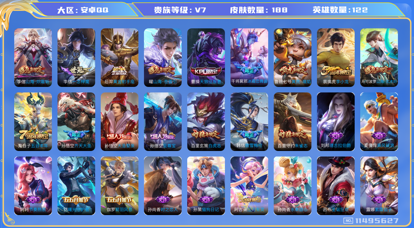 [11495627]V7 7传说 122英雄 188皮肤 可修改实名 优质装备:黄金射手座,一念神魔,山海·炽霜斩(李信年限),山海·苍雷引(电光曜子) 珍宝阁皮:女武神 限定皮:至尊宝,白虎志(电光耗子),傲雪梅枪,齐天大圣,五谷丰年,天狼征服者,李小龙,朱雀志(守约年限),大圣娶亲,冰霜恋舞曲,寅虎·瑞焰(虎皮蛋子),山海·玄木吟(马可年限) 史诗皮:龙之律动,紫霞仙子,千年之狐,江河有灵,百解令(蒙犽),蒙恬荣光圣徽,猫狗日记-孙策,时之恋人-孙尚香,节奏热浪,修罗,女仆咖啡,水果甜心,天才门将,星夜王子,德古拉伯爵,暗隐猎兽者,鬼剑武藏,心灵战警,纤云弄巧,繁星吟游(呼啦呼啦),拒霜思,乘风破浪,水晶猎龙者,曙光守护者,箭羽风息,金属风暴,圣诞狂欢,圣诞恋歌,鹰眼统帅,无心,未来纪元-赵云