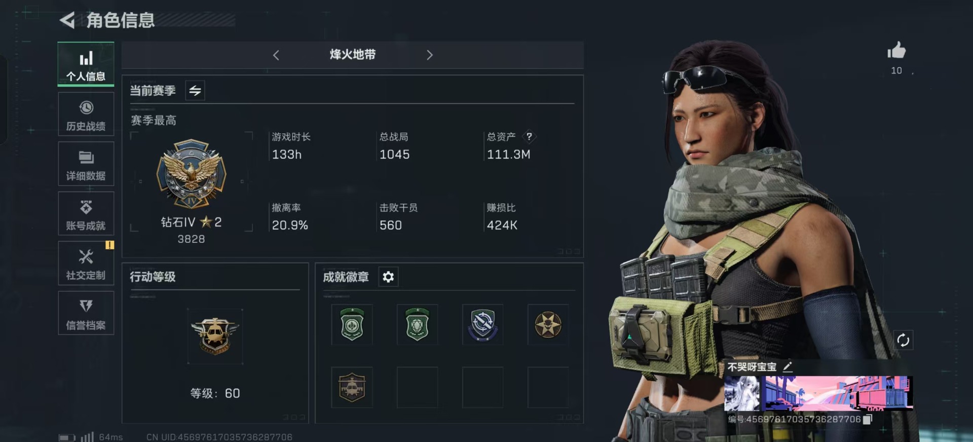 [11495747]总资产:111.3M 1干员外观 10传说枪械 哈夫币:4.941K 高级安全箱(9.17到期) 可二次 可修改实名 烽火地带段位:钻石 全面战场段位:上等兵 传说武器皮肤:UZI冲锋枪-特斯拉线圈,AWM狙击步枪-捞点薯条,腾龙突击步枪-捞点薯条,93R-捞点薯条,AK-12突击步枪-特斯拉线圈,SR-3M紧凑突击步枪-特斯拉线圈,勇士冲锋枪-能天使-午夜邮差,复合弓-黑-天际线,725双管霰弹枪-送葬人-无题密令,CAR-15突击步枪-阿米娅 史诗武器皮肤:M700狙击步枪-蝮蛇,M16A4突击步枪-竞赛选手,M1014霰弹枪-林中猎手,SG552突击步枪-深海恐惧,SVD狙击步枪-暗夜猎手,SV-98狙击步枪-林中猎手,PTR-32突击步枪-英雄,SCAR-H战斗步枪-囚徒,腾龙突击步枪-无垢,MP7冲锋枪-无垢,PSG-1射手步枪-无垢,SR-3M紧凑突击步枪-荒野求生,沙漠之鹰-曙光,Vector冲锋枪-阿萨拉文明 干员外观:蜂医-送葬人·无题密令(S5)