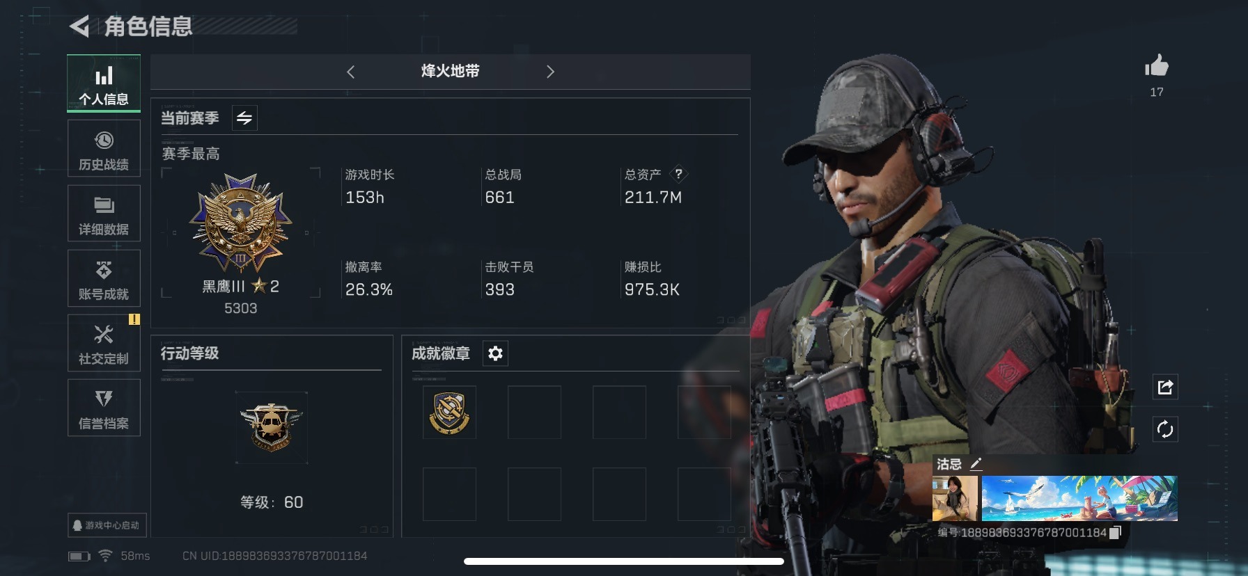 [11496579]总资产:211.7M 3干员外观 1近战传说 13传说枪械 哈夫币:53.918K 高级安全箱(9.17到期) 可二次 可修改实名 优质装备:近战-北极星 烽火地带段位:黑鹰 全面战场段位:无段位 传说武器皮肤:AWM狙击步枪-捞点薯条,腾龙突击步枪-捞点薯条,93R-捞点薯条,勇士冲锋枪-能天使-午夜邮差,复合弓-黑-天际线,K437突击步枪-北极星,QCQ171冲锋枪-北极星,725双管霰弹枪-送葬人-无题密令,M4A1突击步枪-阿米娅,CAR-15突击步枪-阿米娅,AK-12突击步枪-夜鹰,M4A1突击步枪-蚀金玫瑰 史诗武器皮肤:Ash-12战斗步枪-守夜人,M16A4突击步枪-竞赛选手,PKM通用机枪-守夜人,AS Val突击步枪-尖端治疗,M700狙击步枪-守夜人,SG552突击步枪-尖端治疗,SR-25射手步枪-尖端治疗,M1014霰弹枪-林中猎手,勇士冲锋枪-深海恐惧,AKM突击步枪-林中猎手,SV-98狙击步枪-林中猎手,PTR-32突击步枪-英雄,AS Val突击步枪-典狱官,PKM通用机枪-荒野求生,SCAR-H战斗步枪-囚徒,腾龙突击步枪-无垢,MP7冲锋枪-无垢,PSG-1射手步枪-无垢,SVD狙击步枪-荒野求生,SR-3M紧凑突击步枪-荒野求生,QBZ95-1突击步枪-曙光,Vector冲锋枪-阿萨拉文明,S12K霰弹枪-曙光,M700狙击步枪-竞技风 干员外观:红狼-蚀金玫瑰,蜂医-送葬人·无题密令(S5),露娜-黑·天际线