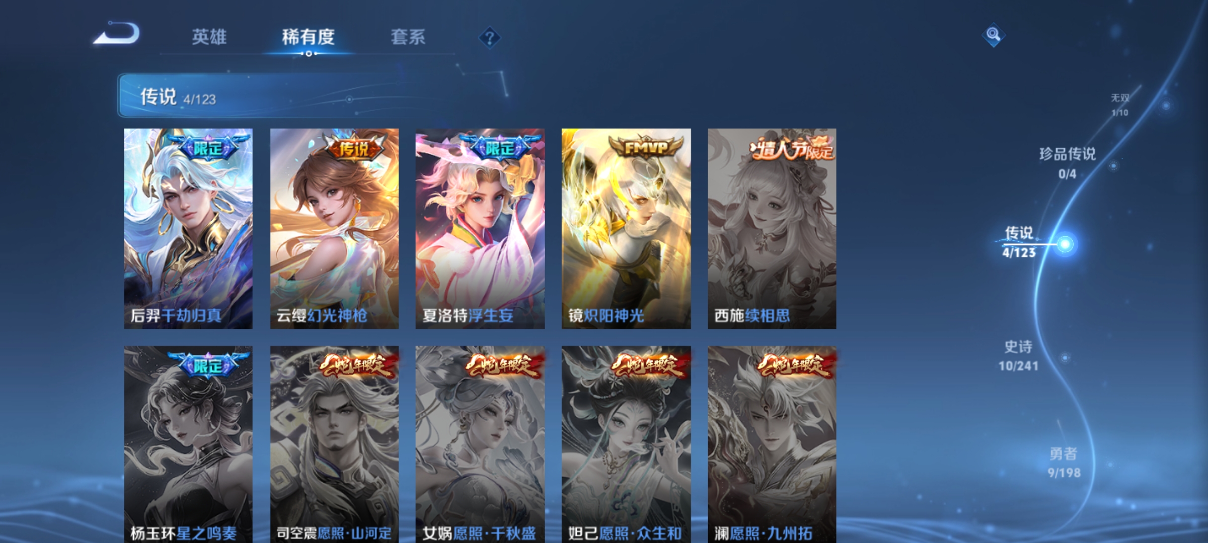 - PX_2104967-Q/尊贵铂金/255皮肤/124英雄/2典藏/0珍品无双/0无双/0珍品传说/17传说/78史诗/8稀有英雄 【2 典藏皮肤】银白咏叹调 铠,无限飓风号 夏侯惇, 【17 传说皮肤】武圣 关羽,启明星使 虞姬,李逍遥 曜,零号·赤焰 孙悟空,永曜之星 杨戬,诗剑行 李白,鹤羽星尊 诸葛亮,炽阳神光 镜,时之恋人 刘备,黄金狮子座 达摩,久胜战神 干将莫邪,末日机甲 孙策,山