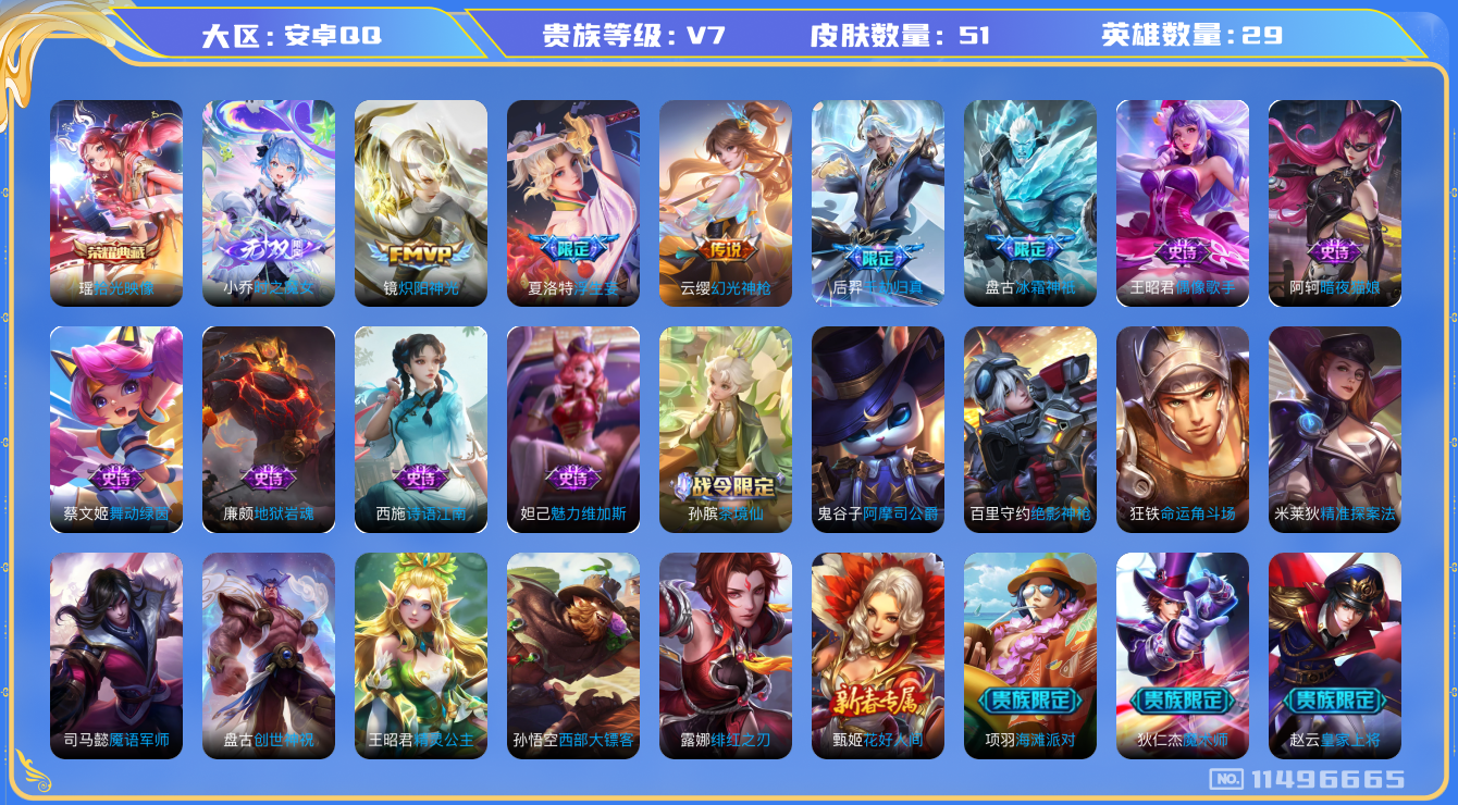 - [11873524]V7 1典藏 6传说 123英雄 198皮肤 可修改实名 优质装备:银白咏叹调(倪克斯侍卫),地狱火,无双飞将,琥珀纪元马超 传说皮:乘龙·淬吴钩(孙策年限),幻光神枪 珍宝阁皮:优雅恋人 限定皮:逐霄战戟,鸣野蒿,神威(电光马子),遇见飞天,梁祝,天狼溯光者,如梦令-后羿,圣诞老人,孙行者,大圣娶亲 史诗皮:化蝶舞,怒海争锋,东方月初,琥珀纪元伽罗,百相守梦-百里守约,紫霞仙子,电玩小子(小书包),白龙吟,特工魅影,千年之狐,江河有灵,高渐离燃音魔法,冰冠公主,偶像歌手,暗夜猫娘,猫狗日记-大乔,乱世虎臣,节奏热浪,水果甜心,绅士熊喵,天才门将,星夜王子,功夫厨神,德古拉伯爵,暗隐猎兽者,幽灵船长,鬼剑武藏,心灵战警,纤云弄巧,逐浪之夏,箭羽风息,原初追逐者,圣诞狂欢,鹰眼统帅,魅力维加斯,未来纪元-赵云