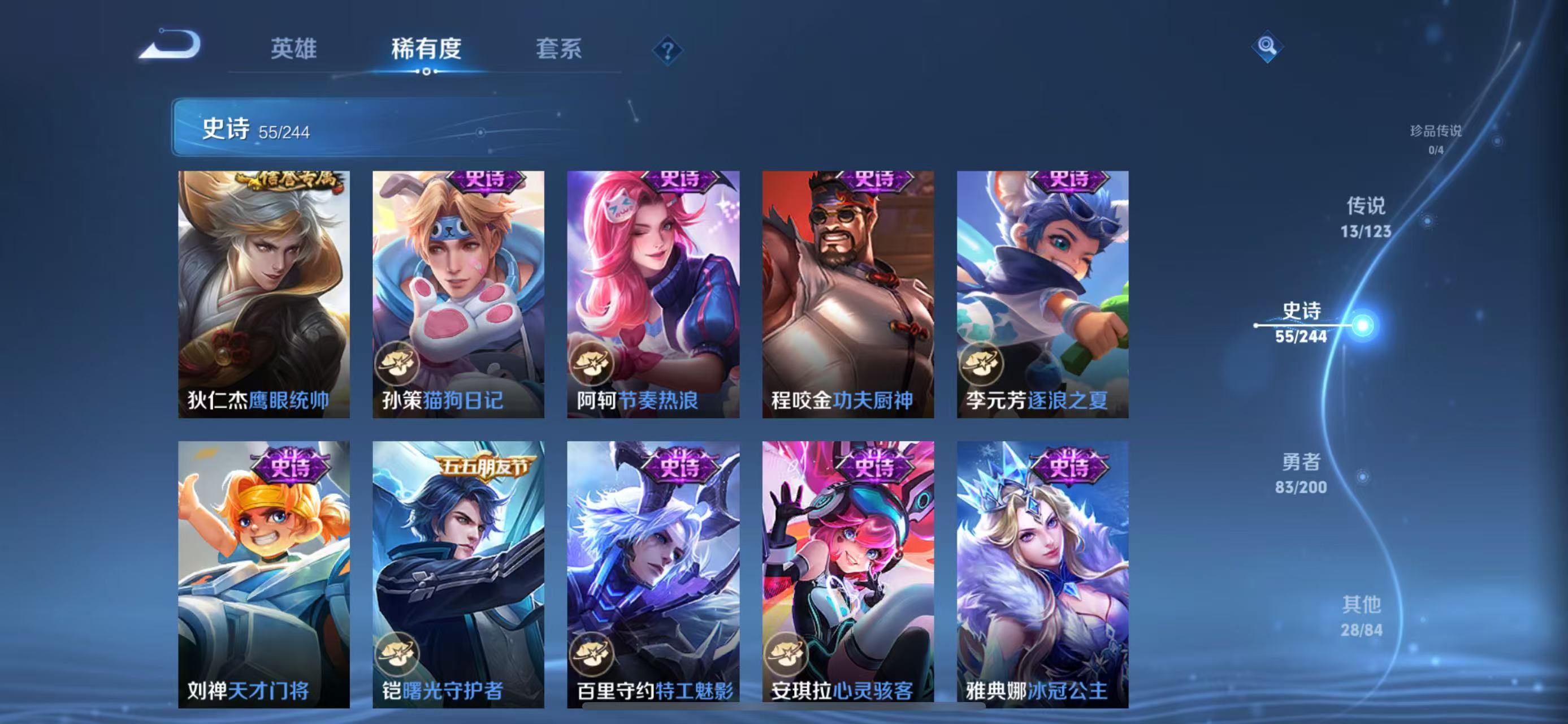 - [12061080]V7 5传说 123英雄 203皮肤 可修改实名 优质装备:黄金射手座,地狱之眼,李逍遥,淬星耀世,涂山容容 珍宝阁皮:玩趣恶龙 限定皮:逐霄战戟,鸣野蒿,至尊宝,五谷丰年,李小龙,孙行者,引擎之心,美猴王,山海·玄木吟(马可年限) 史诗皮:化蝶舞,龙之律动,石田雨龙,茶境仙,埋骨钱,蔬乡物语(鲁班七号),百相守梦-百里守约,百相守梦-黄忠,紫霞仙子,黄金分割率,江河有灵,魅语,冰冠公主,电玩·爆裂旋风,猫狗日记-孙策,猫狗日记-大乔,节奏热浪,摇滚巨星,水果甜心,绅士熊喵,天才门将,星夜王子,心灵骇客,功夫厨神,德古拉伯爵,暗隐猎兽者,幽灵船长,鬼剑武藏,地狱岩魂,乘风破浪,逐浪之夏,水晶猎龙者,曙光守护者,金属风暴,圣诞狂欢,圣诞恋歌,鹰眼统帅,赏金猎手,无心,未来纪元-赵云