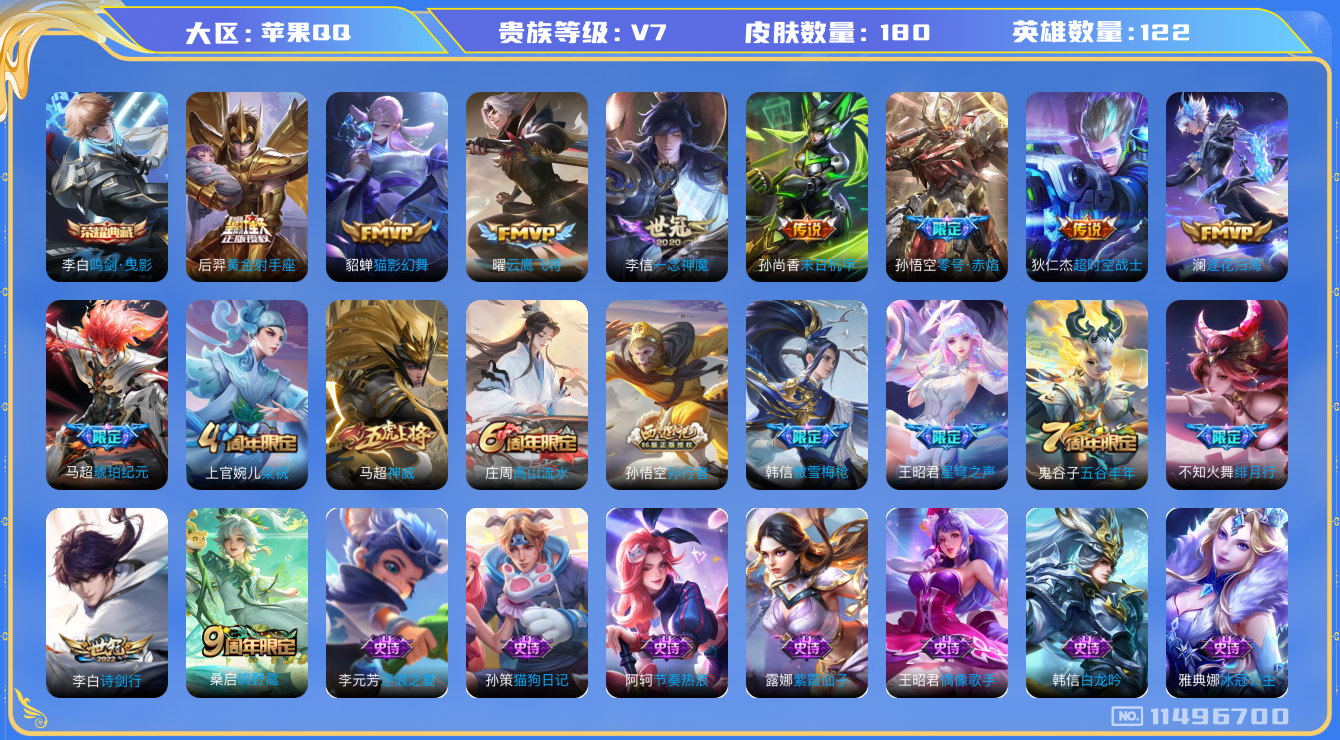- [12235478]V7 1典藏 5传说 123英雄 235皮肤 可修改实名 优质装备:杀手不太冷,云霓雀翎,淬星耀世,碎云 传说皮:幻光神枪 珍宝阁皮:妄想食味 限定皮:逐霄战戟,鸣野蒿,高山流水,朱雀志(守约年限),孙行者 史诗皮:鸭鸭历险记-刘禅,化蝶舞,龙之律动,雪豹·霜爪,埋骨钱,破空之剑,蒙犽顽岩魄,怒海争锋,决胜骁骑,蔬乡物语(鲁班七号),百相守梦-百里守约,特工魅影,千年之狐,冰冠公主,真我赫兹(百里守约),江河有灵,百解令(蒙犽),高渐离燃音魔法,电玩·爆裂旋风,偶像歌手,猫狗日记-孙策,时之恋人-孙尚香,乱世虎臣,节奏热浪,女仆咖啡,水果甜心,绅士熊喵,天才门将,星夜王子,心灵骇客,功夫厨神,德古拉伯爵,暗隐猎兽者,鬼剑武藏,心灵战警,舞动绿茵,纤云弄巧,拒霜思,缤纷独角兽,乘风破浪,月团寄思,箭羽风息,圣诞恋歌,鹰眼统帅,魅力维加斯,奇遇舞章,未来纪元-赵云