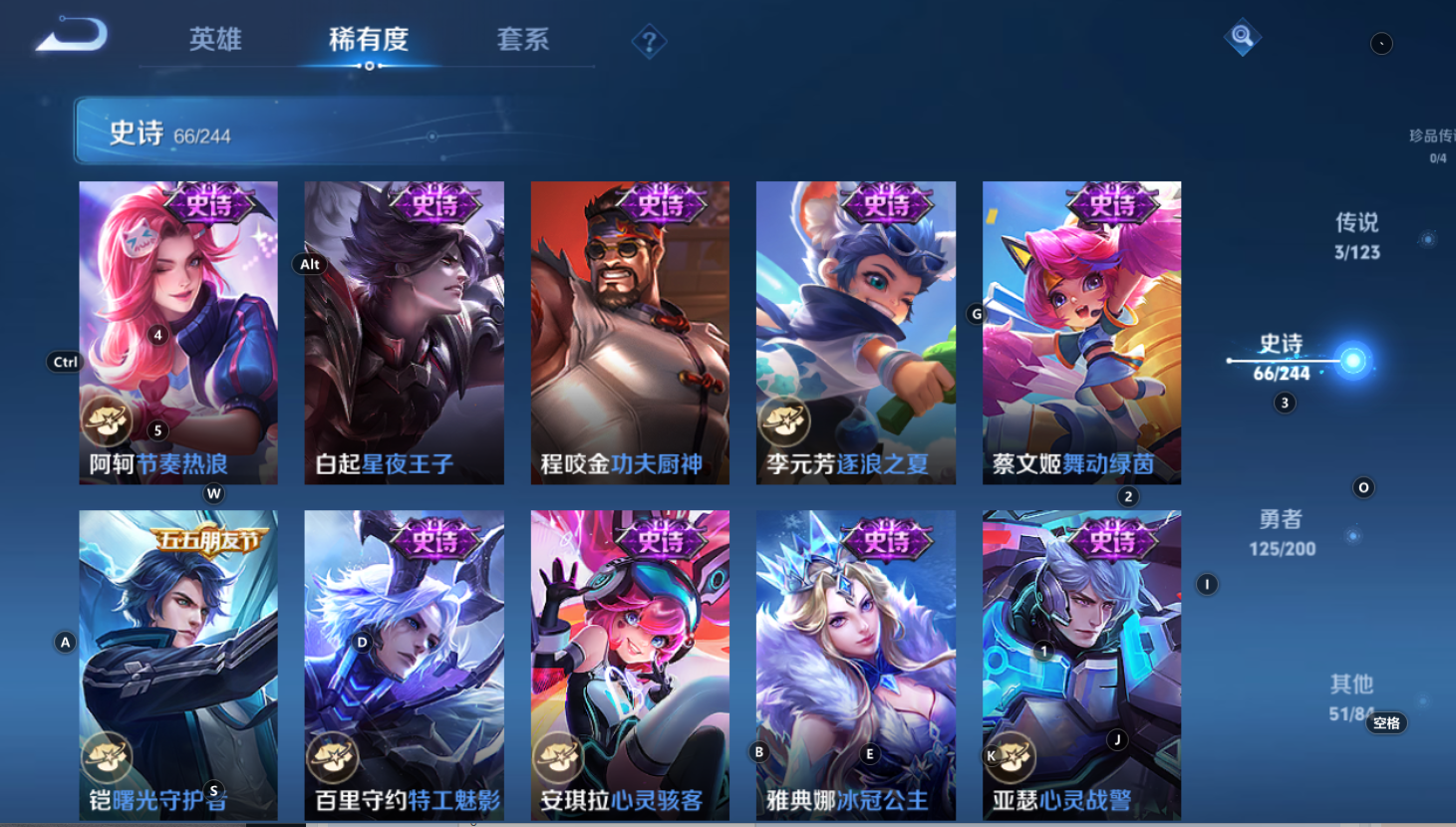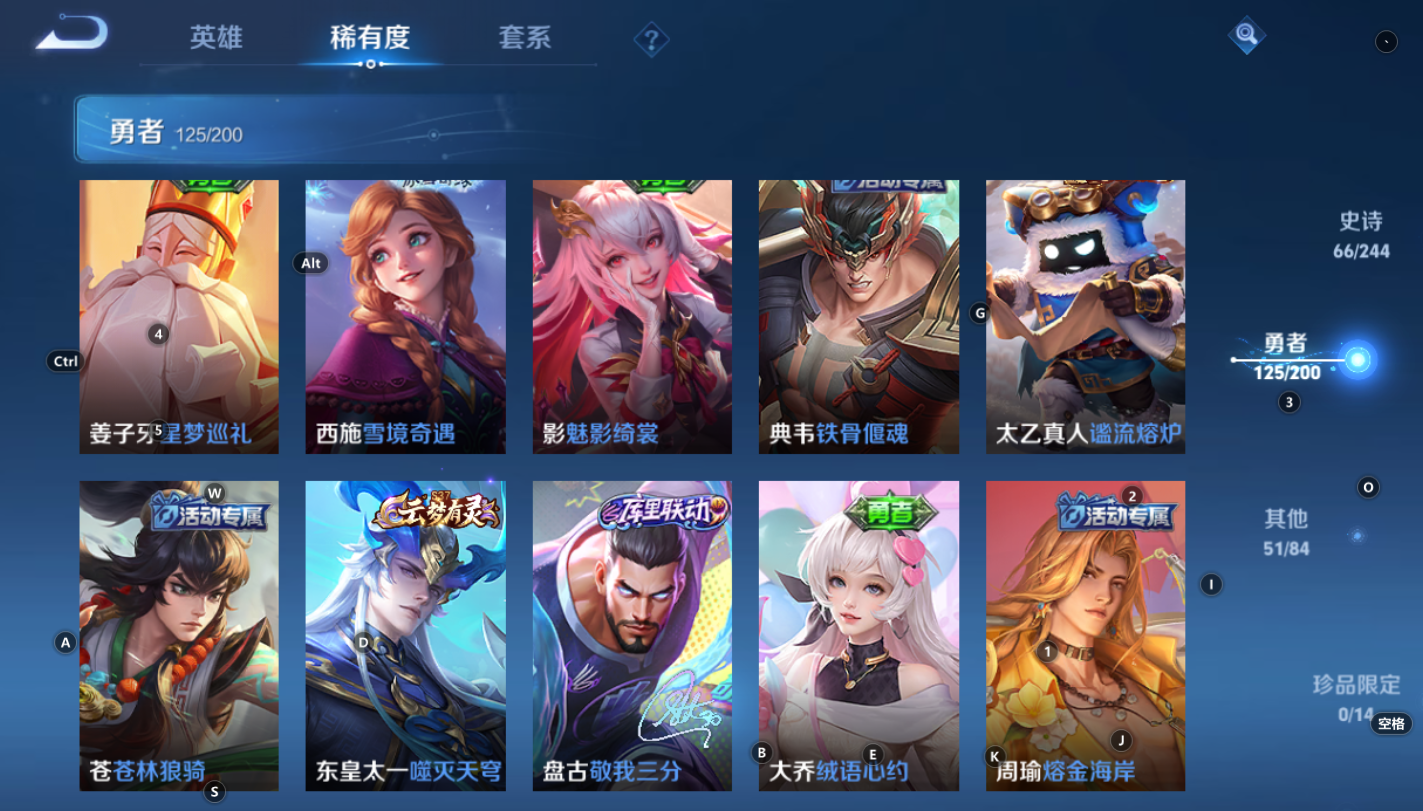- PX_2027649-贵族等级: V7 英雄数: 123 皮肤数: 170 传说皮: 冠军飞将,仲夏夜之梦,山海·苍雷引,妄想实况,澜逐花归海,幻光神枪,祥瑞亨通 限定皮: 冰锋战神,李小龙,梁祝,烈魂,神威,飞衡,五谷丰年,神器·万象笔,山海·玄木吟,齐天大圣,鸣野蒿,逐霄战戟,愿照·千秋盛