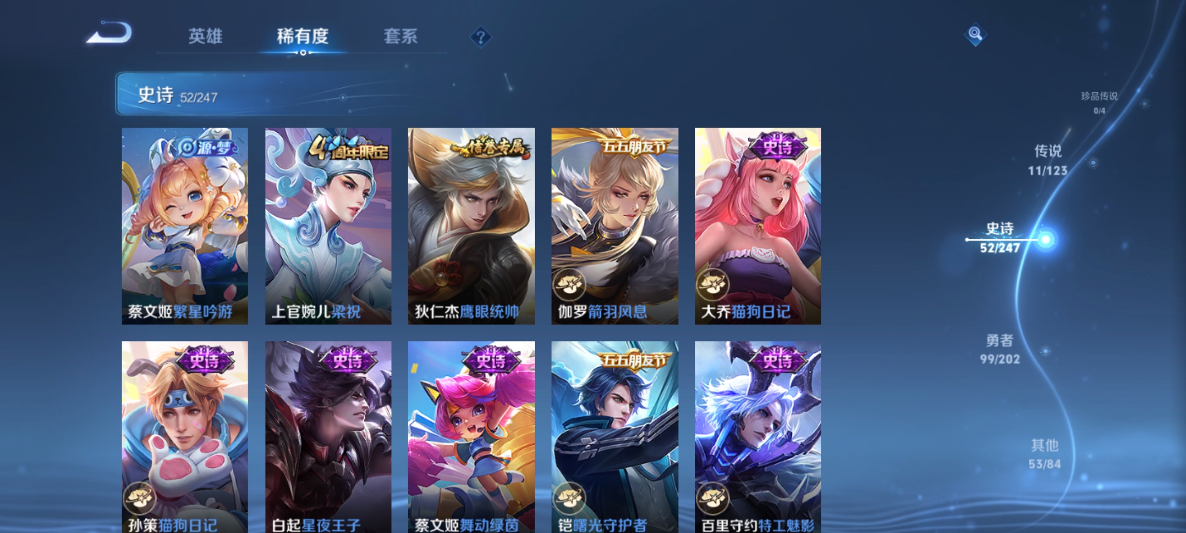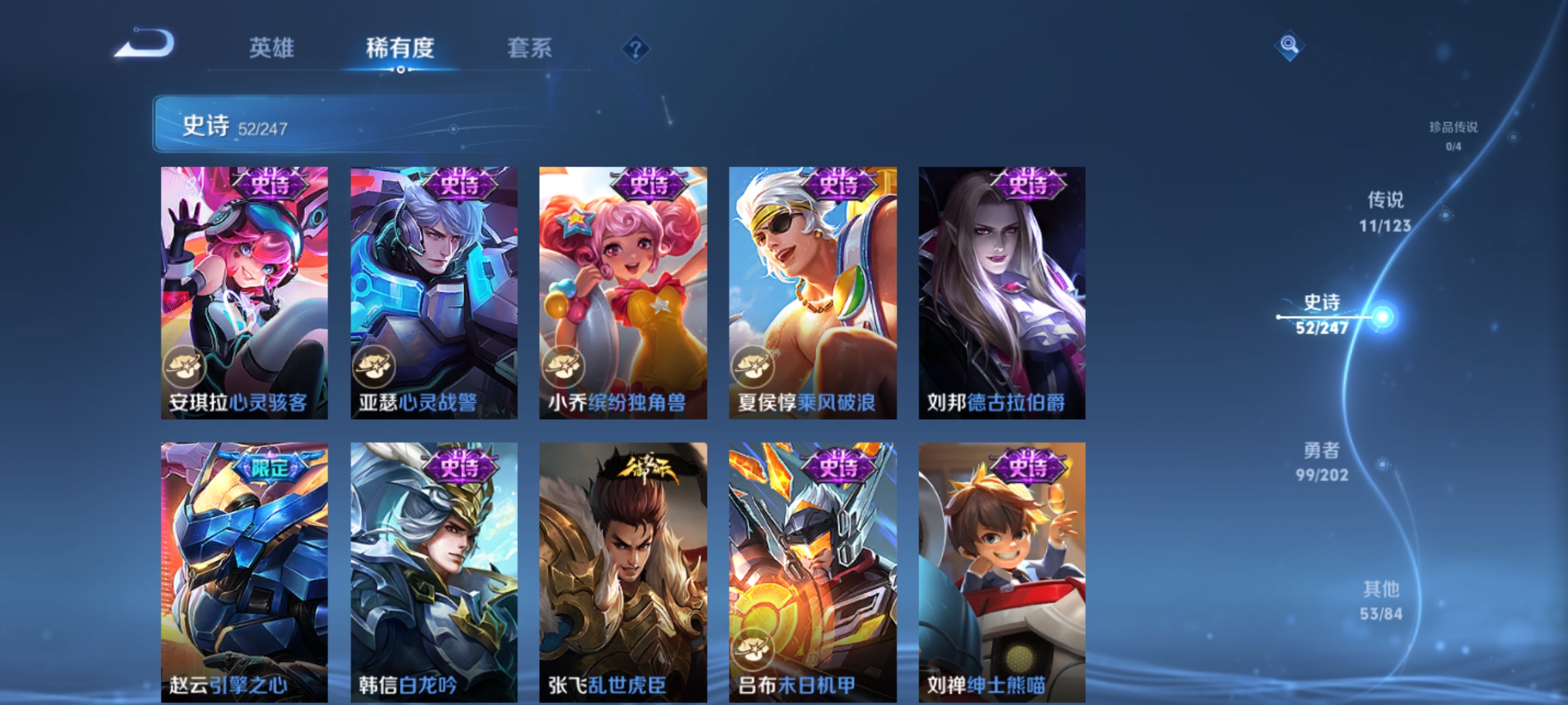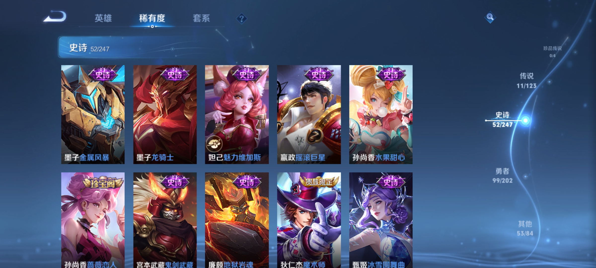 - PX_2063020-安卓V 【可二次】 英雄数量:124 皮肤数量:376 贵族等级:贵族V9 传说数量:0 【星传说 未来机甲 幽冥火 星际治安官】荣耀典藏2 传说品质25 史诗品质107鸣剑曳影 弑枪猎影 李逍遥 白虎志 凤求凰 祈雪灵祝 花朝如约 猫影幻舞 记忆之芯 云霓雀翎 云鹰飞将 时雨天司 深海之息 无双飞将 淬星耀世 寅虎赤拳 武圣 炽阳神光 末日机甲女 异界灵契 枫霜尽 启明星使