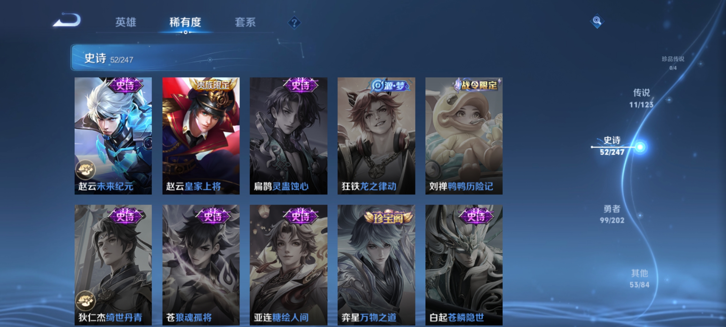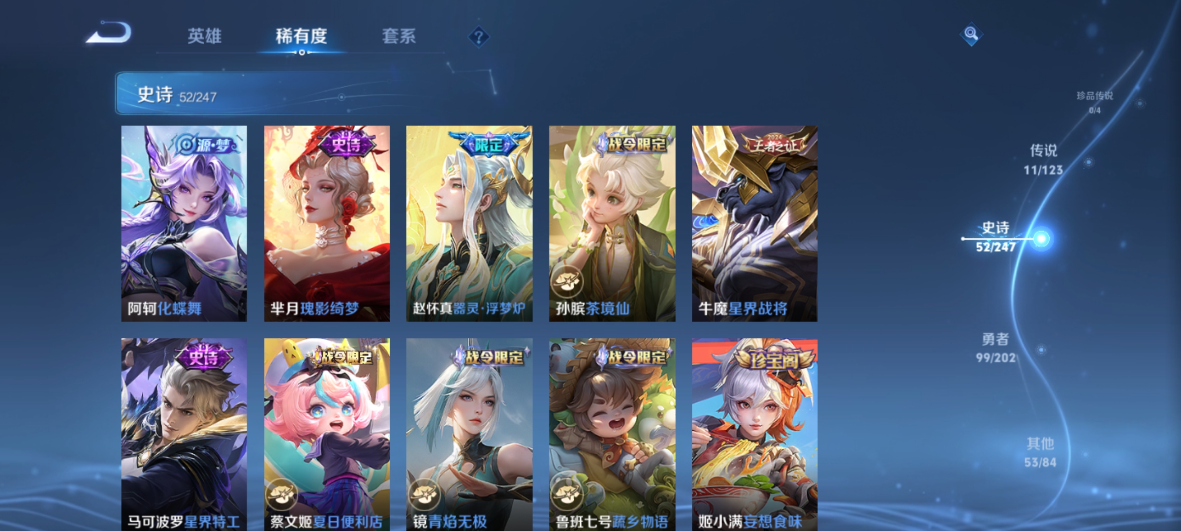 白起狰,曹操烛龙,芈月重明,牛魔御旌,盾山御銮,夏侯惇朔风刀,明世隐疑决卦,老夫子醍醐杖,鬼谷子原初探秘者,狄仁杰万华元夜,程咬金演武夺筹,钟馗驱傩正仪,苏烈千军破阵,弈星混沌棋,达摩沙漠行僧,兰陵王金庭之子,沈梦溪大漠名商,李元芳云中旅人,桑启海盐诗旅,裴擒虎擒涛扼浪,鲁班大师探海日志,张良古海寻踪,项羽苍威无极,镜青焰无极