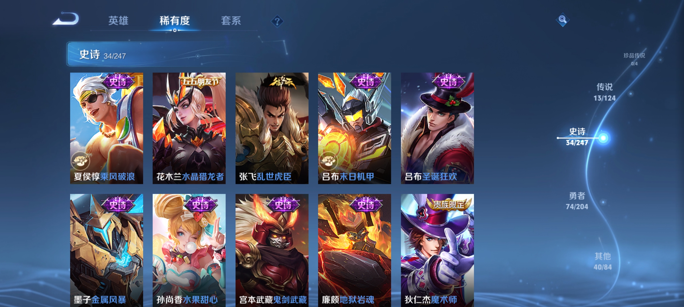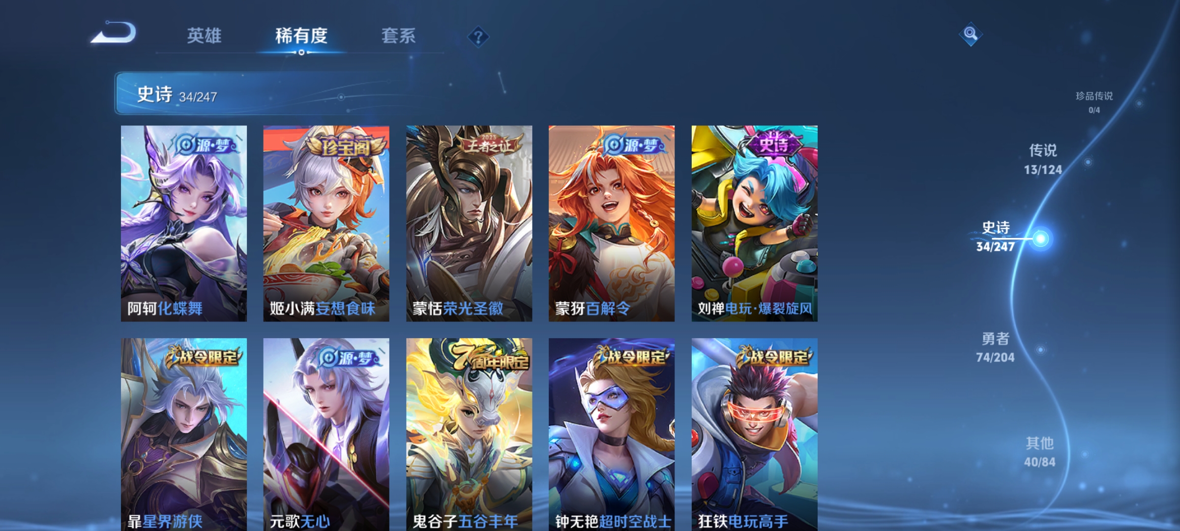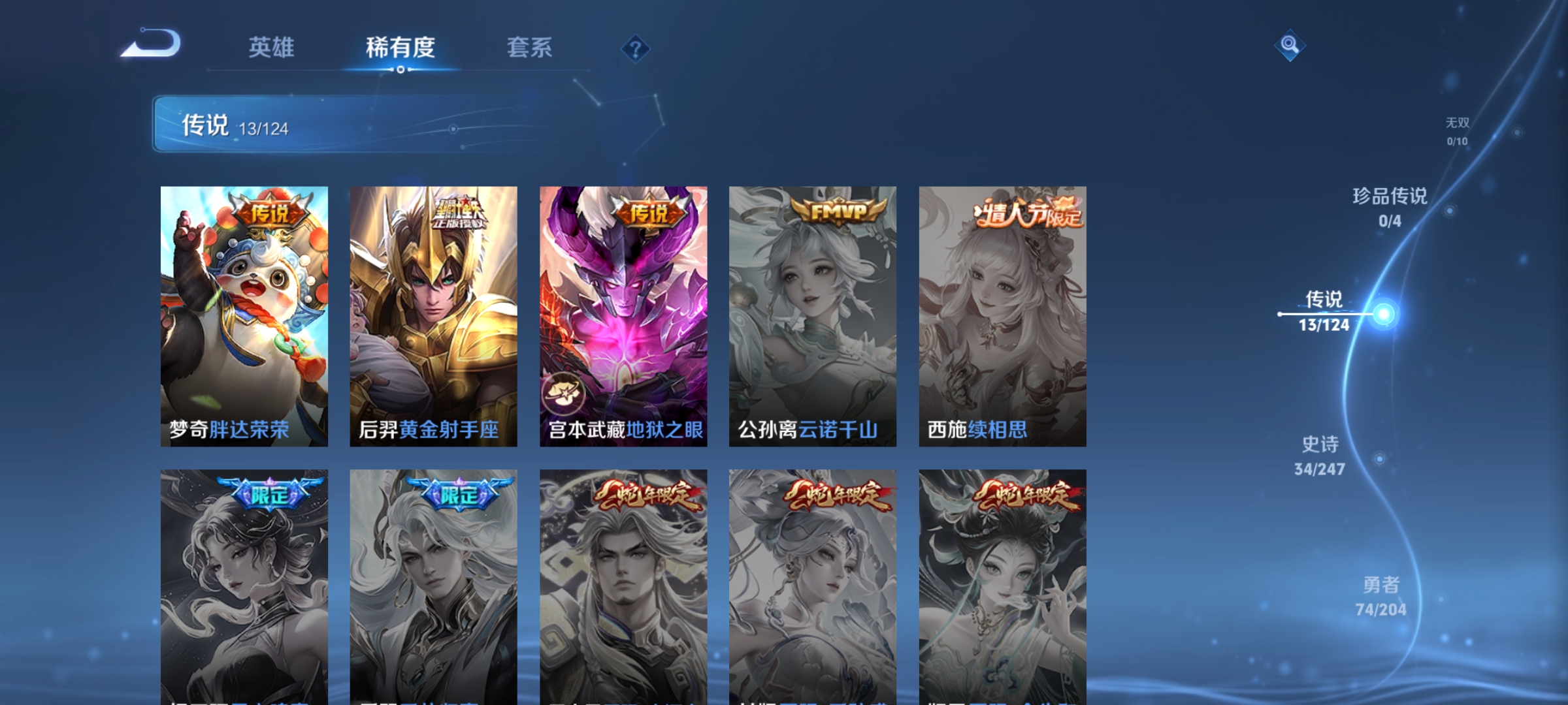 - [11880325]V7 4传说 122英雄 168皮肤 可修改实名 优质装备:炽阳神光,一念神魔,无双飞将 传说皮:祥瑞亨通 珍宝阁皮:玩趣恶龙 限定皮:至尊宝,李小龙,孙行者,大圣娶亲 史诗皮:龙之律动,怒海争锋,蔬乡物语(鲁班七号),白龙吟,黄金分割率,特工魅影,永昼,偶像歌手,末日机甲-吕布,修罗,水果甜心,鬼剑武藏,缤纷独角兽,原初追逐者,圣诞狂欢,圣诞恋歌,鹰眼统帅,王者之锤,魅力维加斯,黎明之约,赏金猎手,未来纪元-赵云