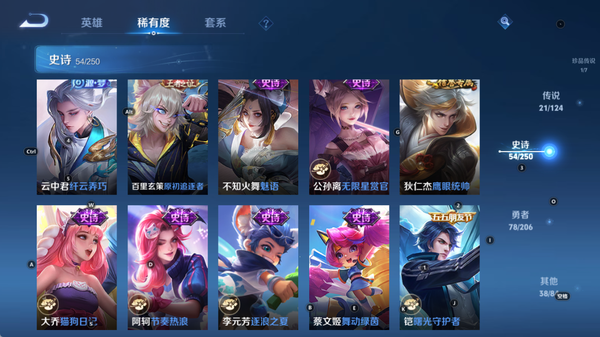 李元芳逐浪之夏,不知火舞魅语,公孙离无限星赏官,大乔猫狗日记,阿轲节奏热浪,露娜紫霞仙子,雅典娜冰冠公主,吕布末日机甲,鲁班七号电玩小子,蒙犽龙鼓争鸣,墨子龙骑士,安琪拉心灵骇客,刘邦德古拉伯爵,兰陵王暗隐猎兽者,曹操幽灵船长,宫本武藏鬼剑武藏,杨戬天秀·启明,蔡文姬舞动绿茵,廉颇地狱岩魂,夏侯惇乘风破浪,花木兰水晶猎龙者,铠曙光守护者,墨子金属风暴,百里玄策原初追逐者,吕布圣诞狂欢,百里守约特工魅影,嫦娥拒霜思,貂蝉唤灵魅影,刘禅电玩·爆裂旋风,蒙犽百解令,海诺心动手记,赵怀真器灵·浮梦炉