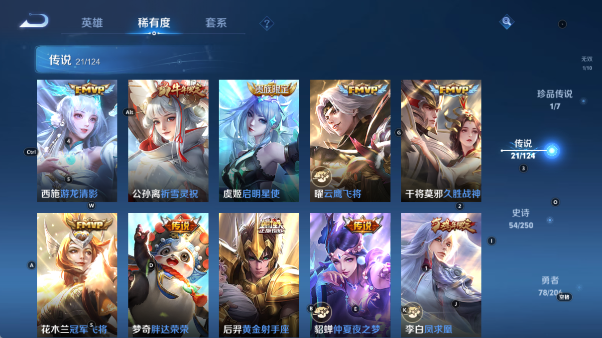 [11496871]曜无双,嫦娥珍传,武则天,司空震蛇年限,澜蛇年限,久胜,小将军,仲夏夜,小青龙,紫霞,至尊宝,马可年限,-可二次-122英雄-193皮肤-1无双-21传说-54史诗 游龙清影-西施 山海·炽霜斩-李信 齐天大圣-孙悟空 凤求凰-李白 祈雪灵祝-公孙离 山海·玄木吟-马可波罗 冰冠公主-雅典娜 至尊宝-孙悟空 街头霸王-韩信