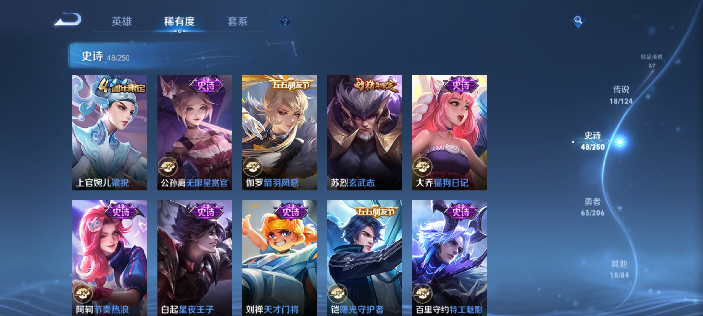 伽罗箭羽风息,公孙离无限星赏官,大乔猫狗日记,阿轲节奏热浪,露娜紫霞仙子,诸葛亮黄金分割率,王昭君偶像歌手,孙尚香时之恋人,雅典娜冰冠公主,嬴政摇滚巨星,刘禅天才门将,白起星夜王子,兰陵王暗隐猎兽者,宫本武藏鬼剑武藏,亚瑟心灵战警,廉颇地狱岩魂,夏侯惇乘风破浪,铠曙光守护者,百里玄策热力回旋,墨子金属风暴,貂蝉圣诞恋歌,百里守约特工魅影,哪吒雪上飞焰,澜赏金猎手,刘备百相守梦,刘禅电玩·爆裂旋风,百里守约真我赫兹,赵怀真鹤归松栖,李元芳匿光侦查者,伽罗琥珀纪元,安琪拉乘龙·聚宝船,赵怀真器灵·浮梦炉