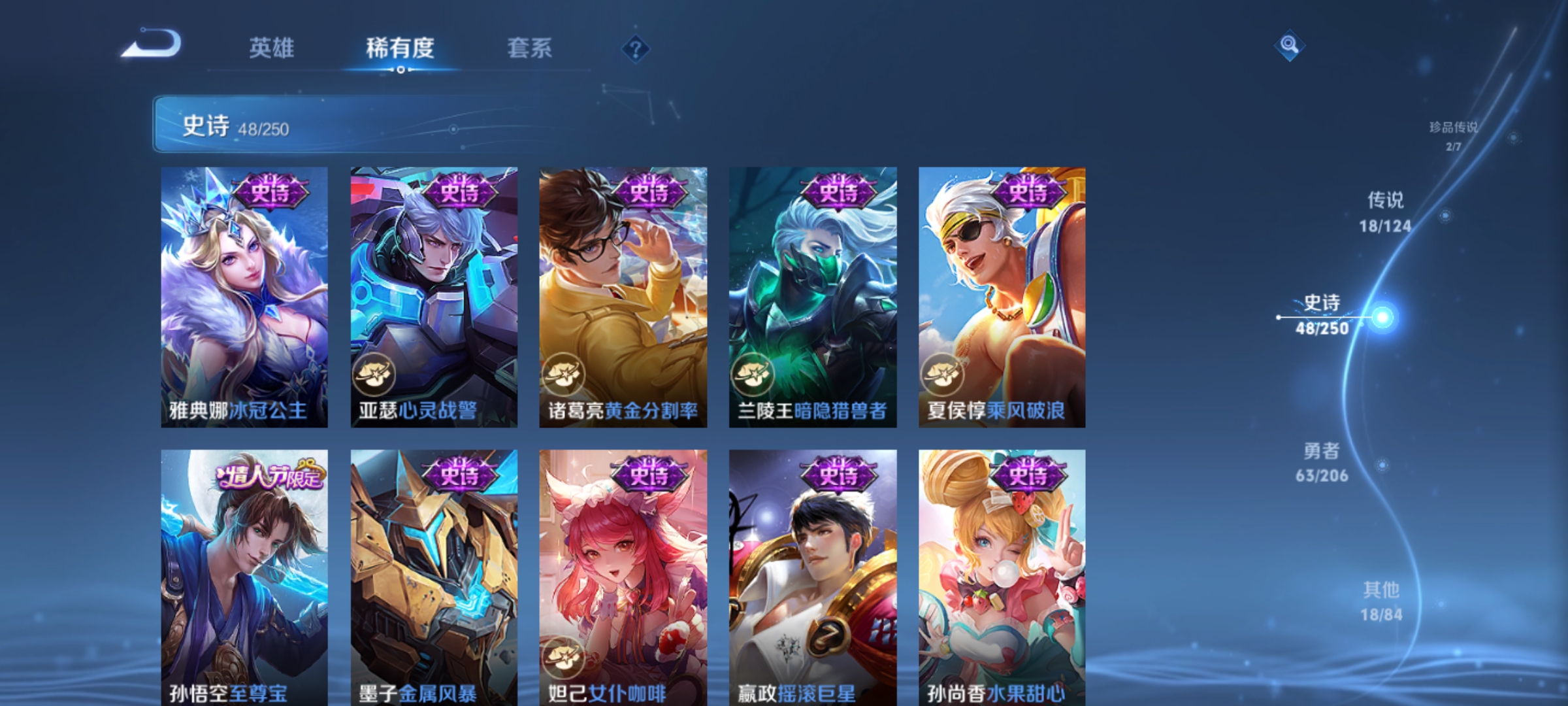[11496892]诸葛亮典藏,曜无双,基德,孙策珍传,司空震蛇年限,澜蛇年限,虞姬蛇年限,孙尚香年限,澜逐花归海,紫霞,至尊宝,-可二次-111英雄-150皮肤-1典藏-1无双-18传说-47史诗 炽阳神光-镜 山海·炽霜斩-李信 百相守梦-刘备 至尊宝-孙悟空 冰冠公主-雅典娜 街头霸王-韩信