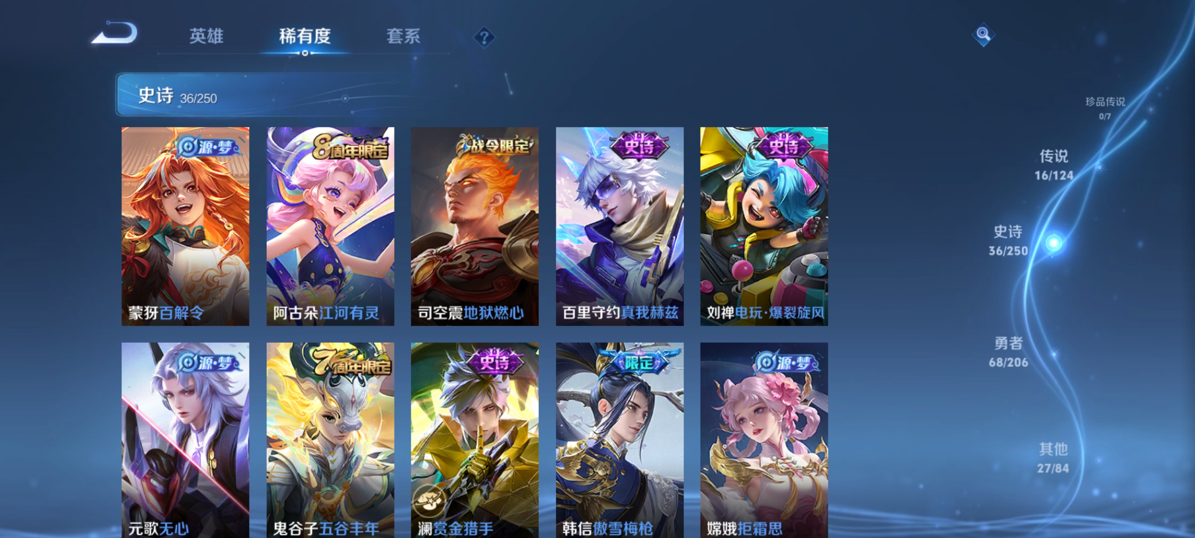 - [11522267]V8 2典藏 1珍品传说 13传说 125英雄 303皮肤 可修改实名 安全保护中 荣耀水晶:银白咏叹调(倪克斯侍卫),全息碎影(猴子典藏) 珍品传说:朽木白哉 传说皮:落雪白狼,幻光神枪,黄金射手座,地狱火,超时空战士-狄仁杰,妄想实况,澜逐花归海 珍宝阁皮:万物之道,优雅恋人 限定皮:愿照·九州拓(澜年限),愿照·岁时盈(虞姬年限),愿照·众生和(妲己年限),至尊宝,飞衡(韩信年限),遇见飞天,高山流水,齐天大圣,游园惊梦,梁祝,御风骁将(吕布年限),龙胆,岱宗(典韦年限),天狼溯光者,天狼征服者,李小龙,默契交锋-花木兰,猪悟能,寅虎·瑞焰(虎皮蛋子),山海·玄木吟(马可年限) 史诗皮:星界战将,茶境仙,器灵·浮梦炉,狼魂孤将,鸭鸭历险记-刘禅,龙之律动,石田雨龙,百相守梦-黄忠,琥珀纪元伽罗,化蝶舞,苍穹之光,电玩小子(小书包),黄金分割率,特工魅影,千年之狐,江河有灵,高渐离燃音魔法,百解令(蒙犽),蒙恬荣光圣徽,青蛇,偶像歌手,晚萤,无限星赏官,电玩·爆裂旋风,百相守梦(刘备),百相守梦(关羽),乱世虎臣,节奏热浪,修罗,女仆咖啡,水果甜心,星夜王子,心灵骇客,功夫厨神,暗隐猎兽者,幽灵船长,鬼剑武藏,心灵战警,舞动绿茵,地狱岩魂,纤云弄巧,繁星吟游(呼啦呼啦),拒霜思,缤纷独角兽,乘风破浪,逐浪之夏,水晶猎龙者,曙光守护者,金属风暴,原初追逐者,圣诞狂欢,圣诞恋歌,鹰眼统帅,魅力维加斯,无心,未来纪元-赵云,玫瑰异探