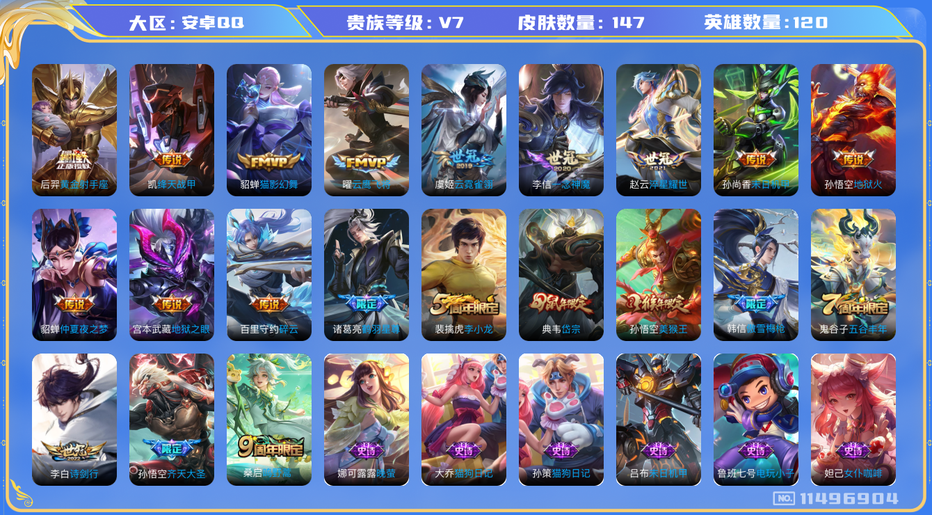 - [11687857]V2 3传说 120英雄 111皮肤 可修改实名 优质装备:久胜战神,超时空战士-狄仁杰,涂山容容 珍宝阁皮:万物之道 限定皮:逐霄战戟,鸣野蒿 史诗皮:鸭鸭历险记-刘禅,星界战将,龙之律动,石田雨龙,蒙犽顽岩魄,星界特工,百相守梦-黄忠,紫霞仙子,特工魅影,江河有灵,冰冠公主,猫狗日记-孙策,节奏热浪,女仆咖啡,水果甜心,绅士熊喵,鬼剑武藏,缤纷独角兽,乘风破浪,逐浪之夏,水晶猎龙者,原初追逐者,圣诞狂欢,鹰眼统帅,魅力维加斯