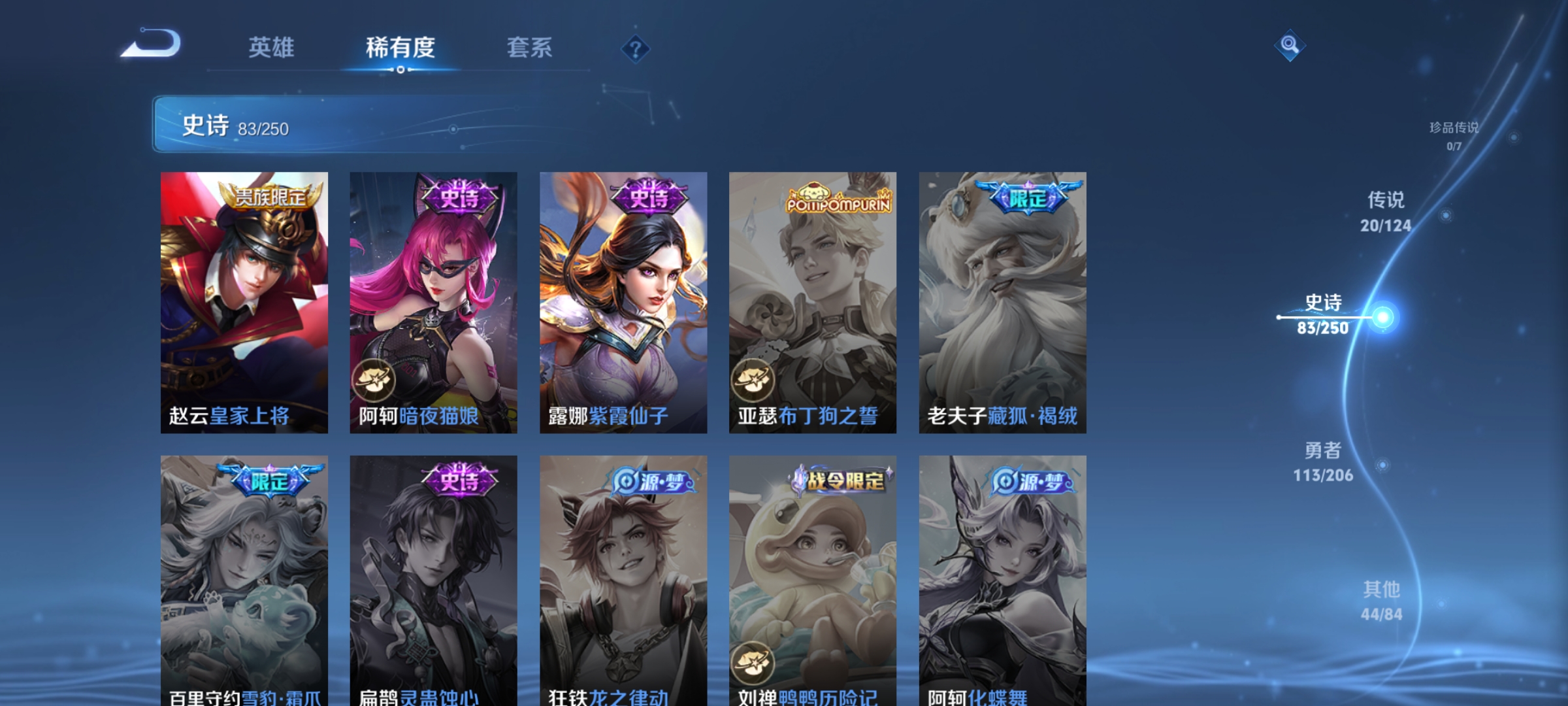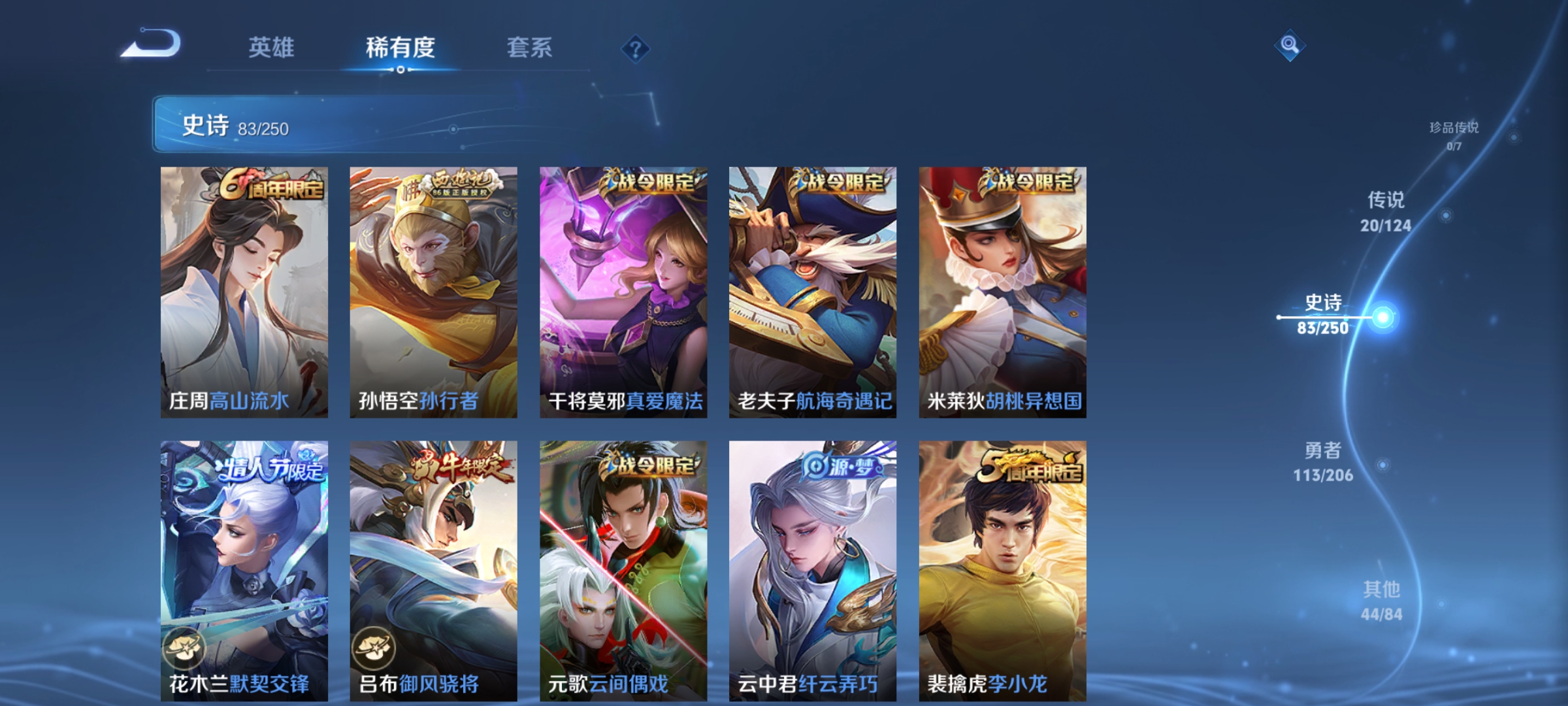 [11496911]澜蛇年限,电光耗子,孙尚香年限,武陵仙君,深海之息,紫霞,至尊宝,马可年限,-可二次-122英雄-260皮肤-20传说-83史诗 淬星耀世-赵云 炽阳神光-镜 白虎志-百里玄策 山海·炽霜斩-李信 齐天大圣-孙悟空 深海之息-马可波罗 武陵仙君-诸葛亮 浮生妄-夏洛特 山海·玄木吟-马可波罗 冰冠公主-雅典娜 神威-马超 烈魂-黄忠 至尊宝-孙悟空 街头霸王-韩信