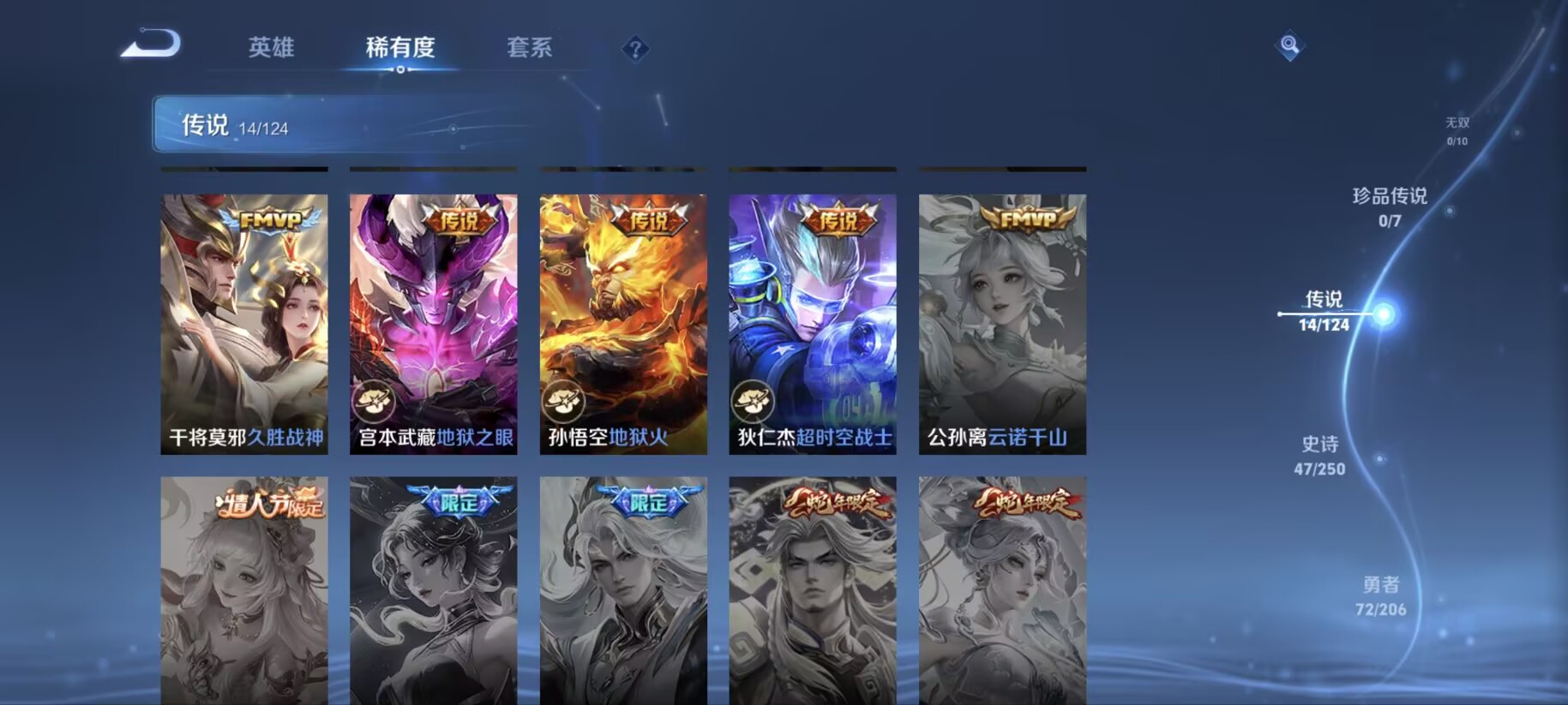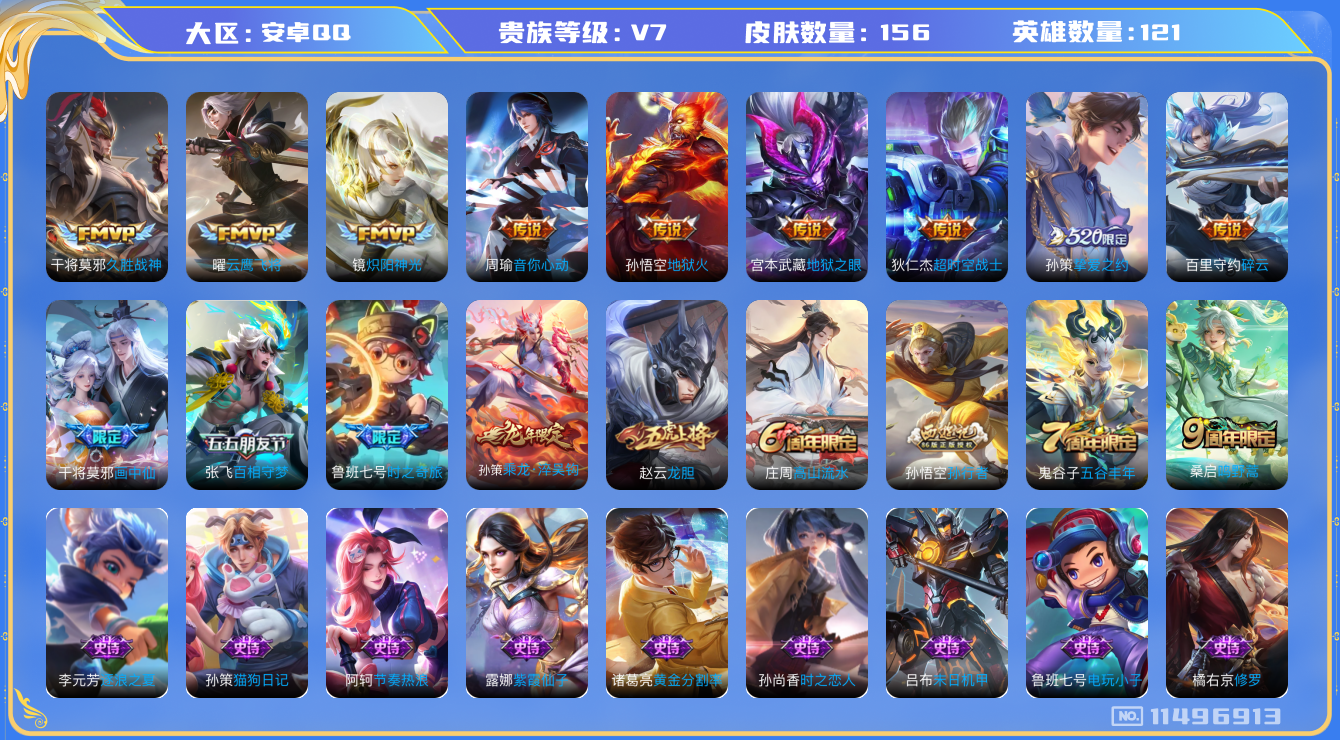 - [12091391]V8 1典藏 1珍品传说 18传说 126英雄 242皮肤 典藏英雄武则天 可修改实名 优质装备:大秦宣太后,怪盗基德,绛天战甲(鸡嘴战神),一念神魔,云霓雀翎,末日机甲-孙尚香(绿蚂蚱),海洋之心,音你心动-周瑜,乞巧织情,时之恋人-刘备(电焊工),超时空战士-狄仁杰,无双飞将,燃星之曲,画中仙,玄雷天君 珍宝阁皮:妄想食味,胡桃夹子 限定皮:愿照·千秋盛(女娲年限),逐霄战戟,映山客,陌上桑,鸣野蒿,傲雪梅枪,遇见飞天,齐天大圣,匿光决锋者,五谷丰年,游园惊梦,烈魂,李小龙,朱雀志(守约年限),女儿国国王 史诗皮:赞萌露比,撼地雄心,破空之剑,百相守梦-百里守约,遇见神鹿,紫霞仙子,电玩小子(小书包),特工魅影,浮梦罗烟,魅语,无限星赏官,冰冠公主,青蛇,偶像歌手,晚萤,暗夜猫娘,百相守梦(关羽),猫狗日记-孙策,猫狗日记-大乔,时之恋人-孙尚香,节奏热浪,修罗,女仆咖啡,摇滚巨星,水果甜心,天才门将,星夜王子,心灵骇客,功夫厨神,德古拉伯爵,暗隐猎兽者,幽灵船长,鬼剑武藏,心灵战警,地狱岩魂,纤云弄巧,缤纷独角兽,乘风破浪,逐浪之夏,龙鼓争鸣,月团寄思,热力回旋,箭羽风息,唤灵魅影,金属风暴,圣诞狂欢,鹰眼统帅,王者之锤,暗夜贵公子,魅力维加斯,黎明之约,奇遇舞章,天秀·音浪,无心,未来纪元-赵云,玫瑰异探