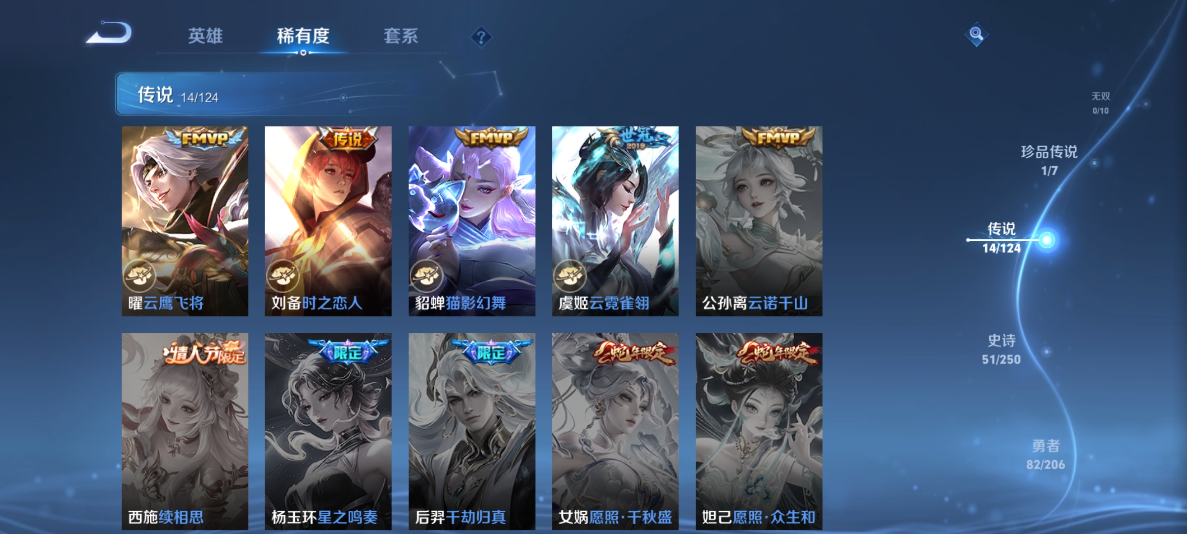 铠绛天战甲,貂蝉猫影幻舞,曜云鹰飞将,镜炽阳神光,西施游龙清影,虞姬云霓雀翎,赵云淬星耀世,刘备时之恋人,李元芳飞鸢探春,王昭君乞巧织情,百里守约碎云,云缨幻光神枪