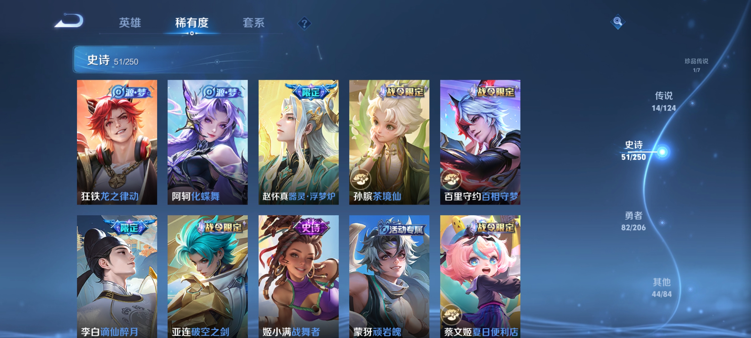 - [12294801]V8 1典藏 1珍品传说 18传说 125英雄 208皮肤 可修改实名 永久限制所有社交场景 优质装备:九霄神辉(木兰典藏),云鹰飞将(小将军),炽阳神光,一念神魔,仲夏夜之梦(大飞蛾),地狱之眼,胖达荣荣,乞巧织情,时之恋人-刘备(电焊工),无双飞将,惊梅引,遇见神鼓,夜礼服假面,霜月吟 珍品传说:时之奇旅-孙策 珍宝阁皮:妄想食味 限定皮:愿照·九州拓(澜年限),逐霄战戟,陌上桑,鸣野蒿,至美·乘鲤谣,诗剑行,五谷丰年,游园惊梦,祈雪灵祝(雪兔子),孙行者 史诗皮:飞车小橘子,器灵·浮梦炉,化蝶舞,星界战将,戍鼓铭心,茶境仙,芈月浮光幕影,海诺心动手记,百相守梦-黄忠,紫霞仙子,江河有灵,匿光侦查者,鹤归松栖(赵怀真),真我赫兹(百里守约),魅语,蒙恬荣光圣徽,冰冠公主,晚萤,末日机甲-吕布,猫狗日记-大乔,时之恋人-孙尚香,修罗,摇滚巨星,水果甜心,绅士熊喵,功夫厨神,德古拉伯爵,暗隐猎兽者,鬼剑武藏,暗渊魔法,舞动绿茵,地狱岩魂,拒霜思,乘风破浪,逐浪之夏,水晶猎龙者,曙光守护者,原初追逐者,圣诞狂欢,鹰眼统帅,魅力维加斯,黎明之约,赏金猎手,无心,未来纪元-赵云