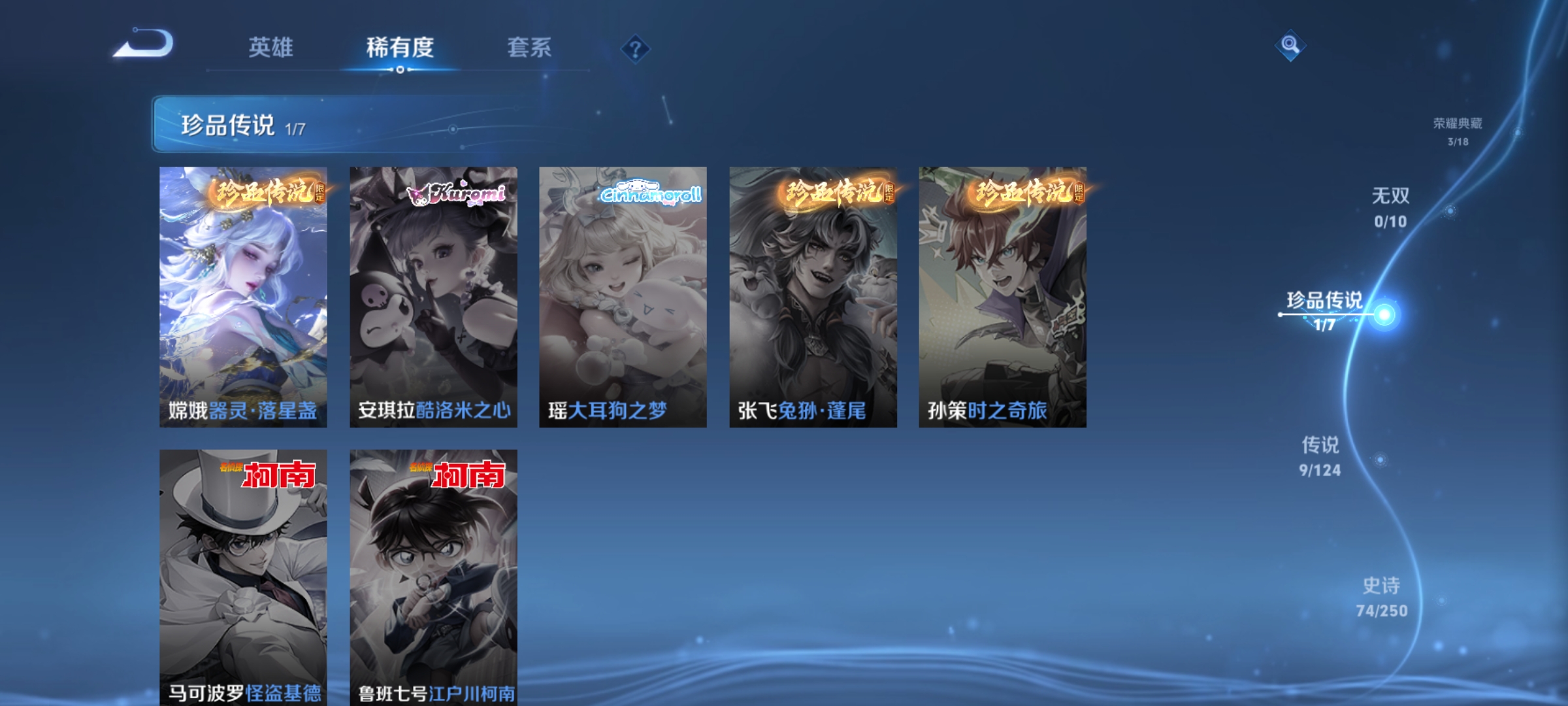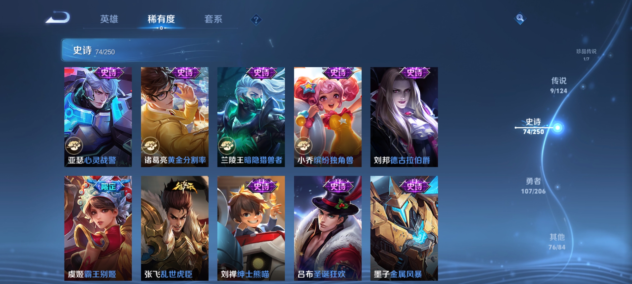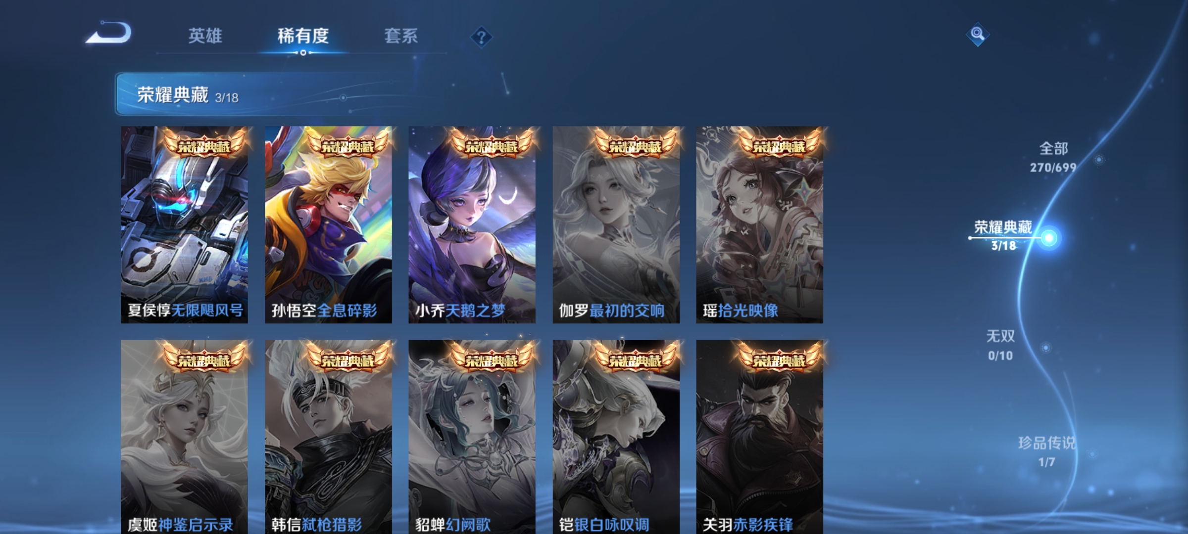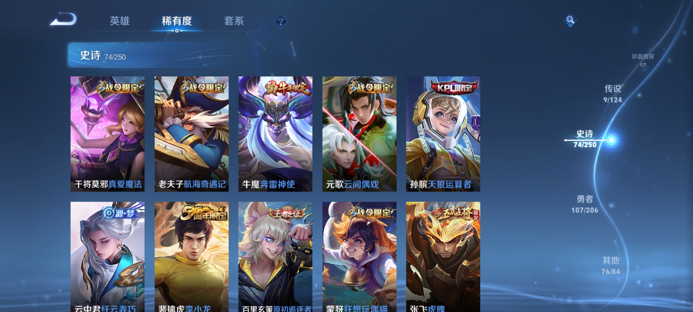- PX_2099921-Q/至尊星耀/61皮肤/70英雄/1典藏/0珍品无双/0无双/1珍品传说/6传说/22史诗/3稀有英雄 【1 珍品传说】器灵·落星盏 嫦娥, 【1 典藏皮肤】星域神启 诸葛亮, 【6 传说皮肤】黄金射手座 后羿,久胜战神 干将莫邪,绛天战甲 铠,黄金白羊座 张良,愿照·九州拓 澜,幻光神枪 云缨, 【22 史诗皮肤】电玩小子 鲁班七号,紫霞仙子 露娜,魅力维加斯 妲己,偶像歌