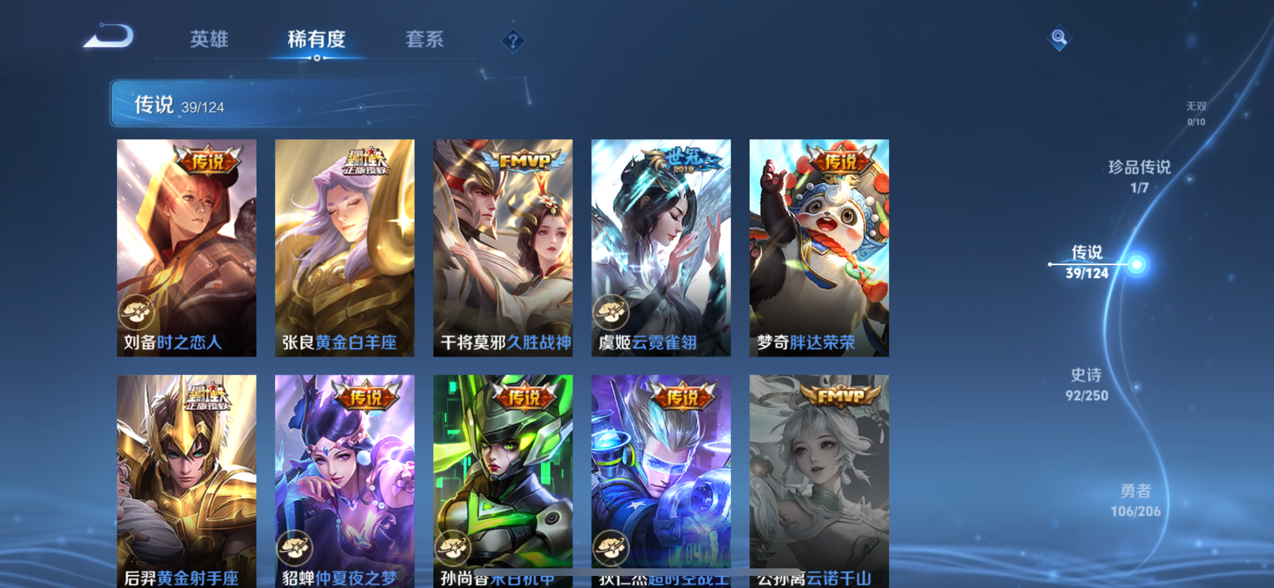 - PX_2077863-【金标钟馗】贵族等级: V7 英雄数: 123 皮肤数: 242 荣耀水晶: 全息碎影 星传说: 零号·雷霆 传说皮: 云鹰飞将,一念神魔,零号·赤焰 限定皮: 遇见飞天,李小龙,梁祝,时雨天司,辉光之辰,冰霜恋舞曲,逐梦之星,逐梦之影,凤求凰,白虎志,至尊宝,大圣娶亲,高山流水,圣诞老人,五谷丰年,山海·玄木吟