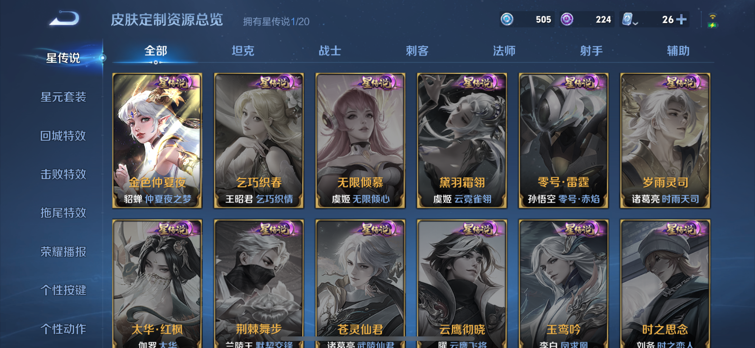 裴擒虎李小龙,赵云龙胆,马超神威,裴擒虎天狼狩猎者,上官婉儿天狼绘梦者,伽罗天狼溯光者,铠青龙志,花木兰瑞麟志,苏烈玄武志,百里守约朱雀志,孙悟空至尊宝,鲁班七号乒乒小将,孙尚香异界灵契,孙悟空孙行者,赵云百木心枪,露娜启示之音,后羿无尽星芒,马可波罗深海之息,金蝉唐三藏,妲己时之奇旅,马可波罗山海·玄木吟,夏侯惇霜北刀,桑启鸣野蒿,艾琳陌上桑,澜愿照·九州拓