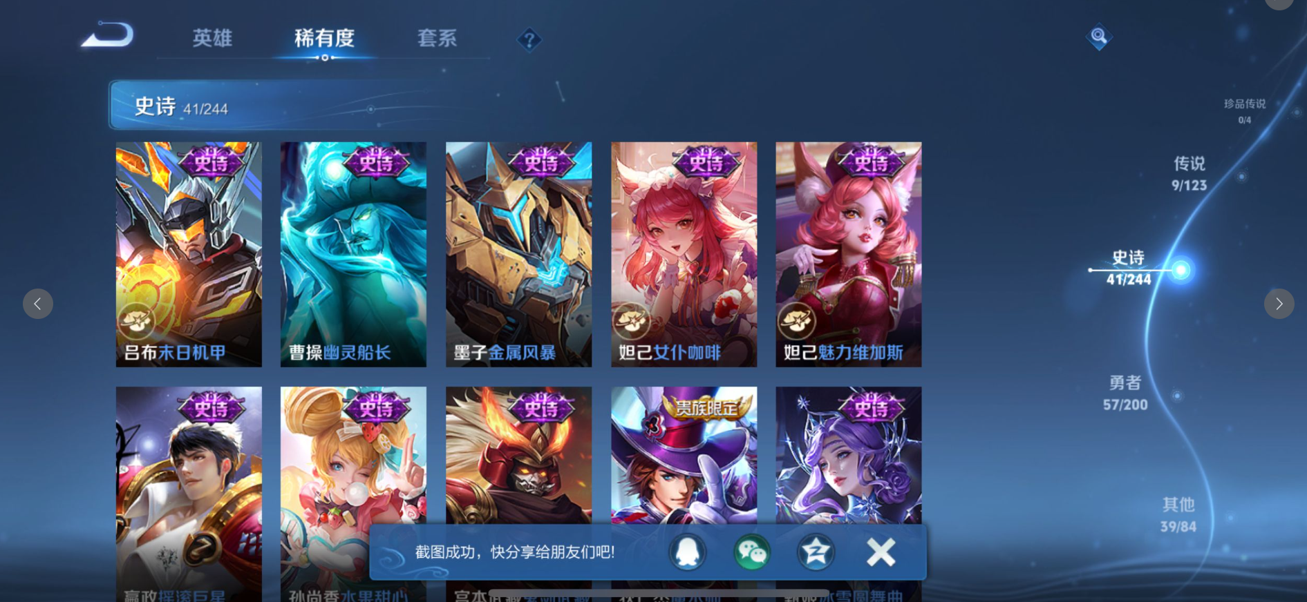 - PX_2096217-81 安卓QQ/最强王者/272皮肤/125英雄/1典藏/0珍品无双/0无双/1珍品传说/12传说/68史诗/9稀有英雄 【1 珍品传说】时之奇旅 孙策, 【1 典藏皮肤】鸣剑·曳影 李白, 【12 传说皮肤】武圣 关羽,无双飞将 马超,地狱火 孙悟空,云鹰飞将 曜,霜月吟 露娜,久胜战神 干将莫邪,绛天战甲 铠,霜北刀 夏侯惇,冥王哈迪斯 铠,黄金白羊座 张良,幻光神枪 云