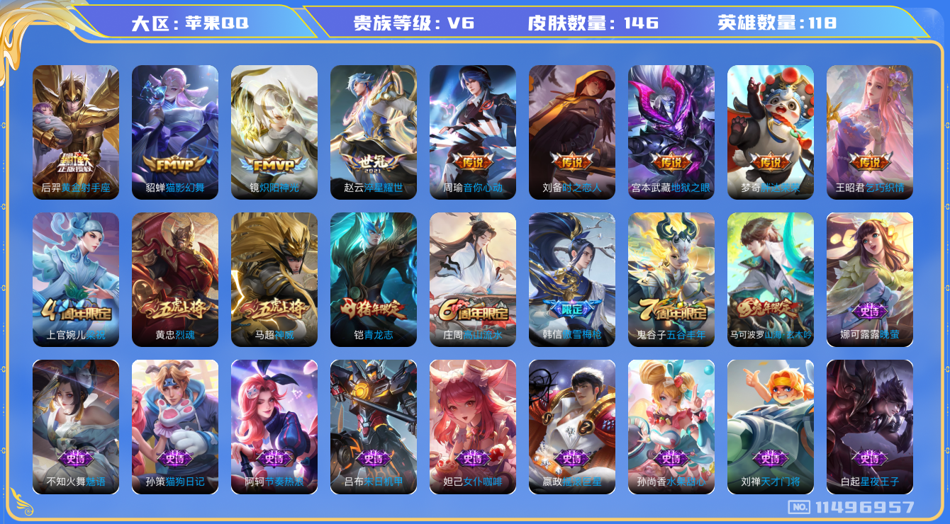 [11496957]马可年限,-可二次-118英雄-146皮肤-9传说-41史诗 淬星耀世-赵云 炽阳神光-镜 神威-马超 山海·玄木吟-马可波罗 烈魂-黄忠 女武神-艾琳 街头霸王-韩信