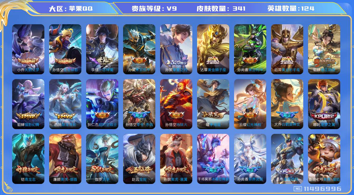 [11496996]V9 2典藏 28传说 124英雄 341皮肤 可修改实名 优质装备:天鹅之梦(小乔典藏),全息碎影(猴子典藏),黄金狮子座,黄金射手座,猫影幻舞,一念神魔,末日机甲-孙尚香(绿蚂蚱),地狱火,零号·赤焰,李逍遥,游龙清影(小青龙),超时空战士-狄仁杰,遇见胡旋,末日机甲-孙策,挚爱之约 传说皮:幻光神枪 珍宝阁皮:优雅恋人,女武神 限定皮:愿照·众生和(妲己年限),逐霄战戟,至尊宝,白虎志(电光耗子),凤求凰(白切鸡),太华(伽罗年限),梅西,武陵仙君(小桃花),异界灵契(白毛香),寅虎·展翼(孙膑年限),白鹤梁神女,时雨天司(水龙头),神威(电光马子),飞衡(韩信年限),遇见飞天,高山流水,五谷丰年,青龙志(铠年限),冰锋战神,武圣,梁祝,天狼狩猎者,龙胆,逐梦之翼,逐梦之星,天狼绘梦者,李小龙,逐梦之影,逐梦之光,朱雀志(守约年限),永曜之星,辉光之辰,如梦令-嫦娥,如梦令-后羿,真爱至上,孙行者,猪悟能,一生所爱,大圣娶亲,引擎之心,天魔缭乱,青春决赛季,冰霜恋舞曲,匿光追影者,寅虎·御盾(廉颇年限),寅虎·瑞焰(虎皮蛋子),寅虎·心曲(虎婆),寅虎·赤拳(老虎年限),无尽星芒 史诗皮:器灵·浮梦炉,谪仙醉月,龙之律动,百相守梦-周瑜,茶境仙,撼地雄心,破空之剑,战舞者,涂山红红,东方月初,紫霞仙子,电玩小子(小书包),黄金分割率,特工魅影,千年之狐,蒙恬荣光圣徽,无限星赏官,冰冠公主,青蛇,偶像歌手,电玩·爆裂旋风,暗夜猫娘,龙骑士(小龙虾),末日机甲-吕布,猫狗日记-孙策,猫狗日记-大乔,乱世虎臣,节奏热浪,女仆咖啡,摇滚巨星,水果甜心,绅士熊喵,天才门将,星夜王子,心灵骇客,时之奇旅-安琪拉,德古拉伯爵,暗隐猎兽者,幽灵船长,鬼剑武藏,心灵战警,乐园奇幻夜,舞动绿茵,地狱岩魂,纤云弄巧,繁星吟游(呼啦呼啦),拒霜思,缤纷独角兽,乘风破浪,逐浪之夏,水晶猎龙者,曙光守护者,箭羽风息,金属风暴,原初追逐者,圣诞狂欢,圣诞恋歌,鹰眼统帅,暗夜贵公子,魅力维加斯,黎明之约,寅虎·御盾,千筹问战,无心,未来纪元-赵云