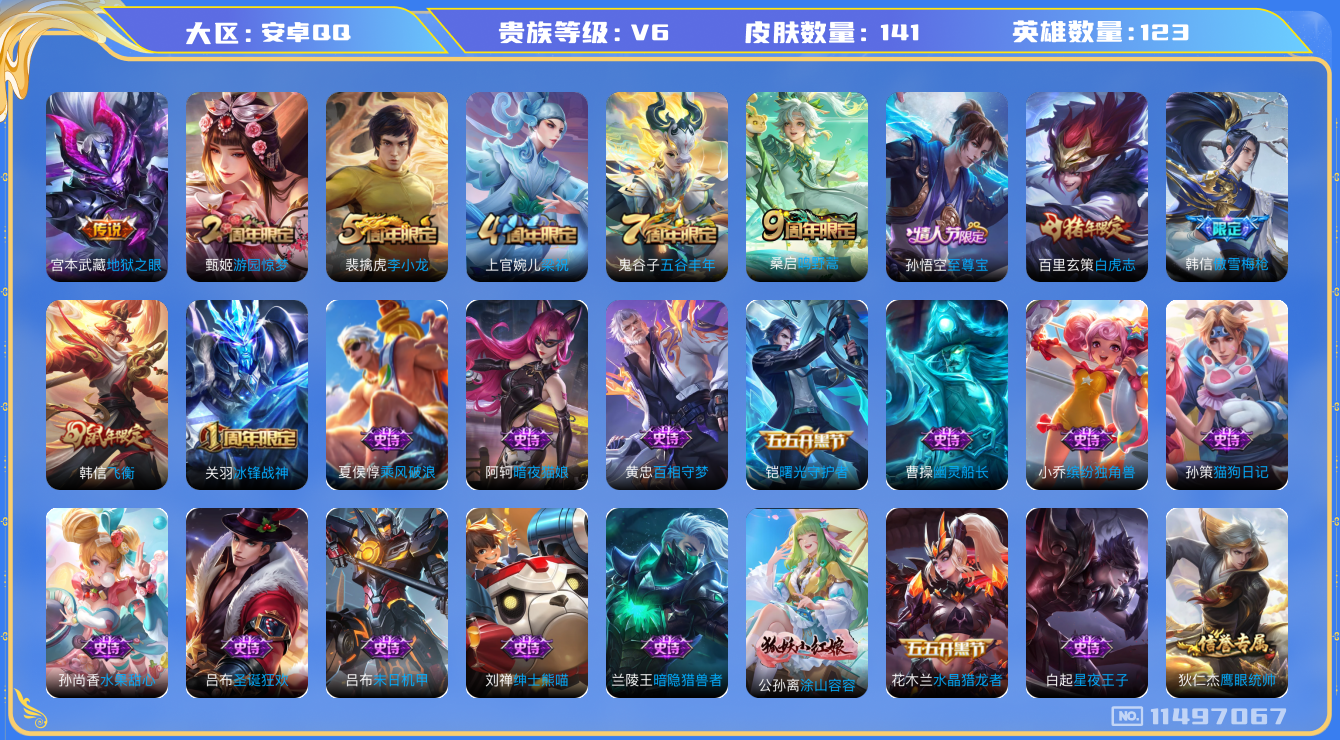 [11497067]V6 3传说 123英雄 141皮肤 可修改实名 优质装备:地狱之眼,涂山容容 珍宝阁皮:蔷薇恋人,玩趣恶龙 限定皮:鸣野蒿,至尊宝,白虎志(电光耗子),傲雪梅枪,飞衡(韩信年限),五谷丰年,冰锋战神,游园惊梦,梁祝,李小龙 史诗皮:百相守梦-黄忠,特工魅影,蒙恬荣光圣徽,偶像歌手,暗夜猫娘,末日机甲-吕布,猫狗日记-孙策,女仆咖啡,水果甜心,绅士熊喵,星夜王子,暗隐猎兽者,幽灵船长,纤云弄巧,缤纷独角兽,乘风破浪,逐浪之夏,水晶猎龙者,曙光守护者,原初追逐者,圣诞狂欢,鹰眼统帅,魅力维加斯,黎明之约,未来纪元-赵云