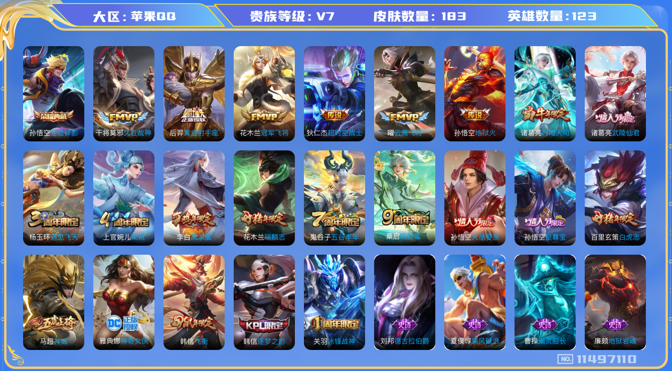[11497110]V7 1典藏 11传说 123英雄 183皮肤 可修改实名 优质装备:全息碎影(猴子典藏),黄金射手座,冠军飞将,云鹰飞将(小将军),久胜战神,地狱火,超时空战士-狄仁杰 珍宝阁皮:蔷薇恋人 限定皮:鸣野蒿,至尊宝,白虎志(电光耗子),凤求凰(白切鸡),武陵仙君(小桃花),时雨天司(水龙头),神威(电光马子),飞衡(韩信年限),瑞麟志(木兰年限),遇见飞天,五谷丰年,冰锋战神,梁祝,逐梦之影,大圣娶亲,神奇女侠 史诗皮:紫霞仙子,苍穹之光,白龙吟,黄金分割率,特工魅影,千年之狐,无限星赏官,冰冠公主,修罗,水果甜心,天才门将,功夫厨神,德古拉伯爵,暗隐猎兽者,幽灵船长,鬼剑武藏,地狱岩魂,繁星吟游(呼啦呼啦),乘风破浪,逐浪之夏,原初追逐者,圣诞狂欢,圣诞恋歌,鹰眼统帅,暗夜贵公子,魅力维加斯,无心