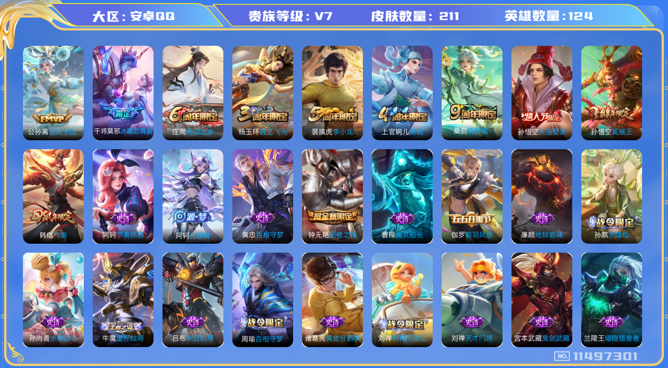 [11497301]V7 2传说 124英雄 211皮肤 可修改实名 优质装备:涂山容容 传说皮:云诺千山 限定皮:鸣野蒿,飞衡(韩信年限),遇见飞天,高山流水,梁祝,李小龙,大圣娶亲,冰霜恋舞曲,美猴王 史诗皮:鸭鸭历险记-刘禅,化蝶舞,星界战将,龙之律动,百相守梦-周瑜,茶境仙,上官婉儿群星魔术团,百相守梦-黄忠,白龙吟,黄金分割率,特工魅影,千年之狐,偶像歌手,末日机甲-吕布,节奏热浪,摇滚巨星,水果甜心,天才门将,星夜王子,功夫厨神,暗隐猎兽者,幽灵船长,鬼剑武藏,乐园奇幻夜,舞动绿茵,地狱岩魂,纤云弄巧,箭羽风息,金属风暴,原初追逐者,圣诞恋歌,鹰眼统帅,王者之锤,魅力维加斯