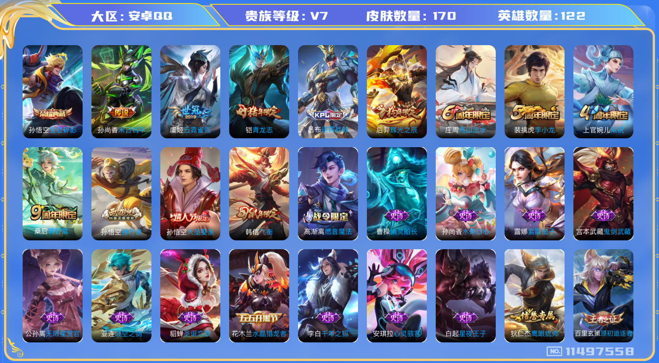 [11497558]V7 1典藏 3传说 122英雄 170皮肤 可修改实名 荣耀水晶:全息碎影(猴子典藏) 传说皮:末日机甲-孙尚香(绿蚂蚱),云霓雀翎 限定皮:逐霄战戟,鸣野蒿,飞衡(韩信年限),高山流水,青龙志(铠年限),梁祝,李小龙,辉光之辰,孙行者,大圣娶亲 史诗皮:破空之剑,紫霞仙子,白龙吟,特工魅影,千年之狐,高渐离燃音魔法,蒙恬荣光圣徽,冰冠公主,无限星赏官,水果甜心,星夜王子,心灵骇客,幽灵船长,鬼剑武藏,纤云弄巧,逐浪之夏,水晶猎龙者,金属风暴,原初追逐者,圣诞恋歌,鹰眼统帅,黎明之约,未来纪元-赵云