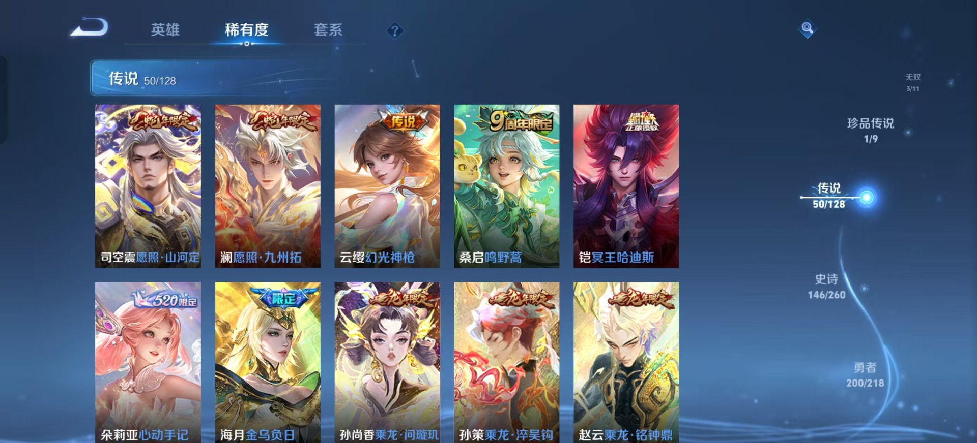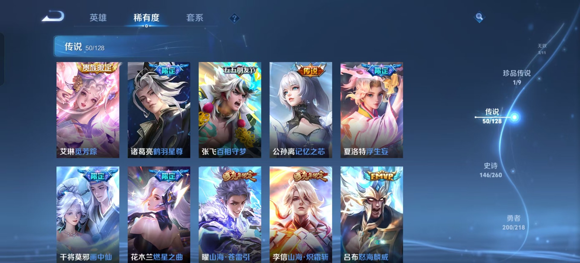 - [12317972]V7 1典藏 11传说 122英雄 211皮肤 可修改实名 优质装备:鸣剑·曳影,黄金狮子座,炽阳神光,一念神魔,末日机甲-孙尚香(绿蚂蚱),超时空战士-狄仁杰,无双飞将,澜逐花归海 珍宝阁皮:妄想食味,胡桃夹子 限定皮:愿照·九州拓(澜年限),愿照·山河定(司空震年限),鸣野蒿,遇见飞天,齐天大圣,五谷丰年,冰锋战神,逐梦之星,李小龙 史诗皮:星界战将,茶境仙,破空之剑,蔬乡物语(鲁班七号),百相守梦-百里守约,紫霞仙子,苍穹之光,白龙吟,特工魅影,千年之狐,江河有灵,魅语,蒙恬荣光圣徽,冰冠公主,青蛇,偶像歌手,电玩·爆裂旋风,猫狗日记-孙策,猫狗日记-大乔,节奏热浪,修罗,摇滚巨星,水果甜心,天才门将,星夜王子,功夫厨神,德古拉伯爵,暗隐猎兽者,幽灵船长,鬼剑武藏,天秀·启明,地狱岩魂,缤纷独角兽,乘风破浪,逐浪之夏,水晶猎龙者,金属风暴,原初追逐者,圣诞狂欢,圣诞恋歌,鹰眼统帅,魅力维加斯,黎明之约,无心,未来纪元-赵云