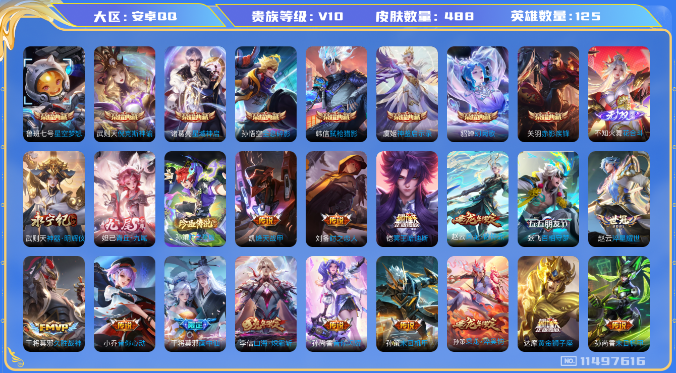[11497616]V10 8典藏 3无双 1珍品传说 50传说 125英雄 488皮肤 典藏英雄武则天 可修改实名 优质装备:星空梦想(太空人),倪克斯神谕(宇宙婆娘),全息碎影(猴子典藏),星域神启(倪克斯贼亮),赤影疾锋,幻阙歌(貂蝉典藏),弑枪猎影(韩信典藏),神器·明辉仪,青丘·九尾(妲己无双),神鉴启示录,花合斗,黄金狮子座,黄金射手座,冠军飞将,云鹰飞将(小将军),绛天战甲(鸡嘴战神),黄金白羊座,猫影幻舞,久胜战神,炽阳神光,云霓雀翎,末日机甲-孙尚香(绿蚂蚱),地狱火,仲夏夜之梦(大飞蛾),音你心动-小乔,零号·赤焰,地狱之眼,音你心动-周瑜,胖达荣荣,乞巧织情,时之恋人-刘备(电焊工),淬星耀世,超时空战士-狄仁杰,末日机甲-孙策,无双飞将,音你闪耀(rap皮),碎云,天秀幻梦,神器·明辉仪,山海·炽霜斩(李信年限),山海·苍雷引(电光曜子),燃星之曲,画中仙,浮生妄,记忆之芯(机甲兔),青丘·九尾,百相守梦(张飞),鹤羽星尊,艾琳觅芳踪,金乌负日,朵莉亚心动手记,涂山容容 珍品传说:时之奇旅-孙策 传说皮:乘龙·问璇玑(孙尚香年限),乘龙·铭钟鼎(赵云年限),乘龙·淬吴钩(孙策年限),铠冥王哈迪斯,幻光神枪 珍宝阁皮:妄想食味,胡桃夹子,玩趣恶龙 限定皮:愿照·九州拓(澜年限),愿照·山河定(司空震年限),逐霄战戟,鸣野蒿,至尊宝,凤求凰(白切鸡),武陵仙君(小桃花),瑞麟志(木兰年限),遇见飞天,高山流水,怒海麟威,五谷丰年,冰锋战神,游园惊梦,梁祝,烈魂,李小龙,如梦令-后羿,孙行者,大圣娶亲,天魔缭乱,云端筑梦师,女儿国国王,神器·万象笔,山海·玄木吟(马可年限) 史诗皮:鸭鸭历险记-刘禅,化蝶舞,灵蛊蚀心,星界战将,龙之律动,石田雨龙,百相守梦-周瑜,茶境仙,怒海争锋,破空之剑,涂山红红,东方月初,蒙犽顽岩魄,芈月浮光幕影,海诺心动手记,蔬乡物语(鲁班七号),乘龙·聚宝船(安琪拉年限),乘龙·忆丹青(大乔年限),百相守梦-百里守约,百相守梦-黄忠,织梦人,遇见神鹿,紫霞仙子,苍穹之光,电玩小子(小书包),白龙吟,黄金分割率,特工魅影,千年之狐,永昼,江河有灵,魅语,百解令(蒙犽),高渐离燃音魔法,蒙恬荣光圣徽,无限星赏官,冰冠公主,青蛇,偶像歌手,白蛇,晚萤,电玩·爆裂旋风,百相守梦(刘备),暗夜猫娘,百相守梦(关羽),银翎春语,龙骑士(小龙虾),末日