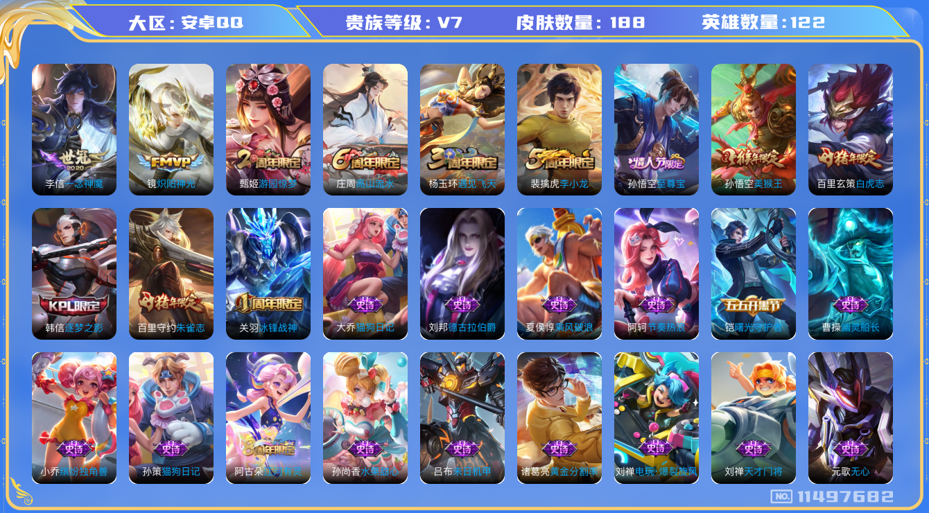 [11497682]V7 3传说 122英雄 188皮肤 可修改实名 传说皮:一念神魔,炽阳神光 珍宝阁皮:蔷薇恋人 限定皮:至尊宝,白虎志(电光耗子),遇见飞天,高山流水,冰锋战神,游园惊梦,李小龙,逐梦之影,朱雀志(守约年限),美猴王 史诗皮:黄金分割率,千年之狐,江河有灵,百解令(蒙犽),蒙恬荣光圣徽,电玩·爆裂旋风,末日机甲-吕布,猫狗日记-孙策,猫狗日记-大乔,节奏热浪,水果甜心,天才门将,星夜王子,心灵骇客,德古拉伯爵,暗隐猎兽者,幽灵船长,鬼剑武藏,舞动绿茵,缤纷独角兽,乘风破浪,水晶猎龙者,曙光守护者,金属风暴,原初追逐者,鹰眼统帅,魅力维加斯,无心