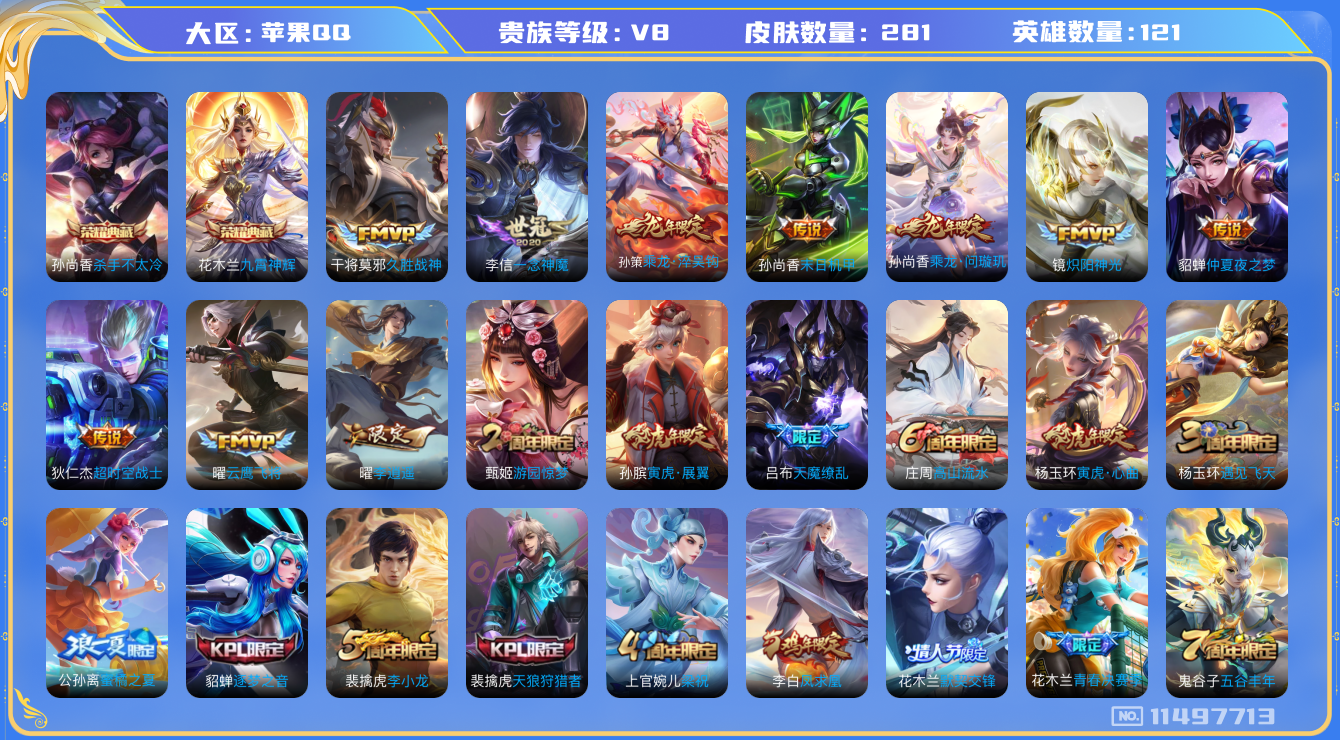[11497713]V8 2典藏 14传说 121英雄 281皮肤 可修改实名 荣耀水晶:九霄神辉(木兰典藏),杀手不太冷 传说皮:乘龙·问璇玑(孙尚香年限),乘龙·淬吴钩(孙策年限),李逍遥,仲夏夜之梦(大飞蛾),末日机甲-孙尚香(绿蚂蚱),一念神魔,久胜战神,云鹰飞将(小将军),炽阳神光,超时空战士-狄仁杰 珍宝阁皮:女武神,玩趣恶龙 限定皮:白虎志(电光耗子),凤求凰(白切鸡),凤凰于飞,寅虎·展翼(孙膑年限),神威(电光马子),遇见飞天,高山流水,五谷丰年,游园惊梦,梁祝,天狼狩猎者,逐梦之音,李小龙,霸王别姬-虞姬,默契交锋-花木兰,猪悟能,引擎之心,天魔缭乱,青春决赛季,蜜橘之夏,寅虎·心曲(虎婆) 史诗皮:星界战将,紫霞仙子,白龙吟,黄金分割率,特工魅影,千年之狐,永昼,江河有灵,百解令(蒙犽),蒙恬荣光圣徽,冰冠公主,偶像歌手,晚萤,无限星赏官,暗夜猫娘,末日机甲-吕布,猫狗日记-孙策,乱世虎臣,节奏热浪,女仆咖啡,摇滚巨星,水果甜心,绅士熊喵,天才门将,星夜王子,时之奇旅-安琪拉,功夫厨神,德古拉伯爵,暗隐猎兽者,幽灵船长,心灵战警,地狱岩魂,纤云弄巧,繁星吟游(呼啦呼啦),拒霜思,缤纷独角兽,乘风破浪,逐浪之夏,水晶猎龙者,热力回旋,金属风暴,原初追逐者,圣诞狂欢,圣诞恋歌,鹰眼统帅,王者之锤,黎明之约,赏金猎手,无心,未来纪元-赵云