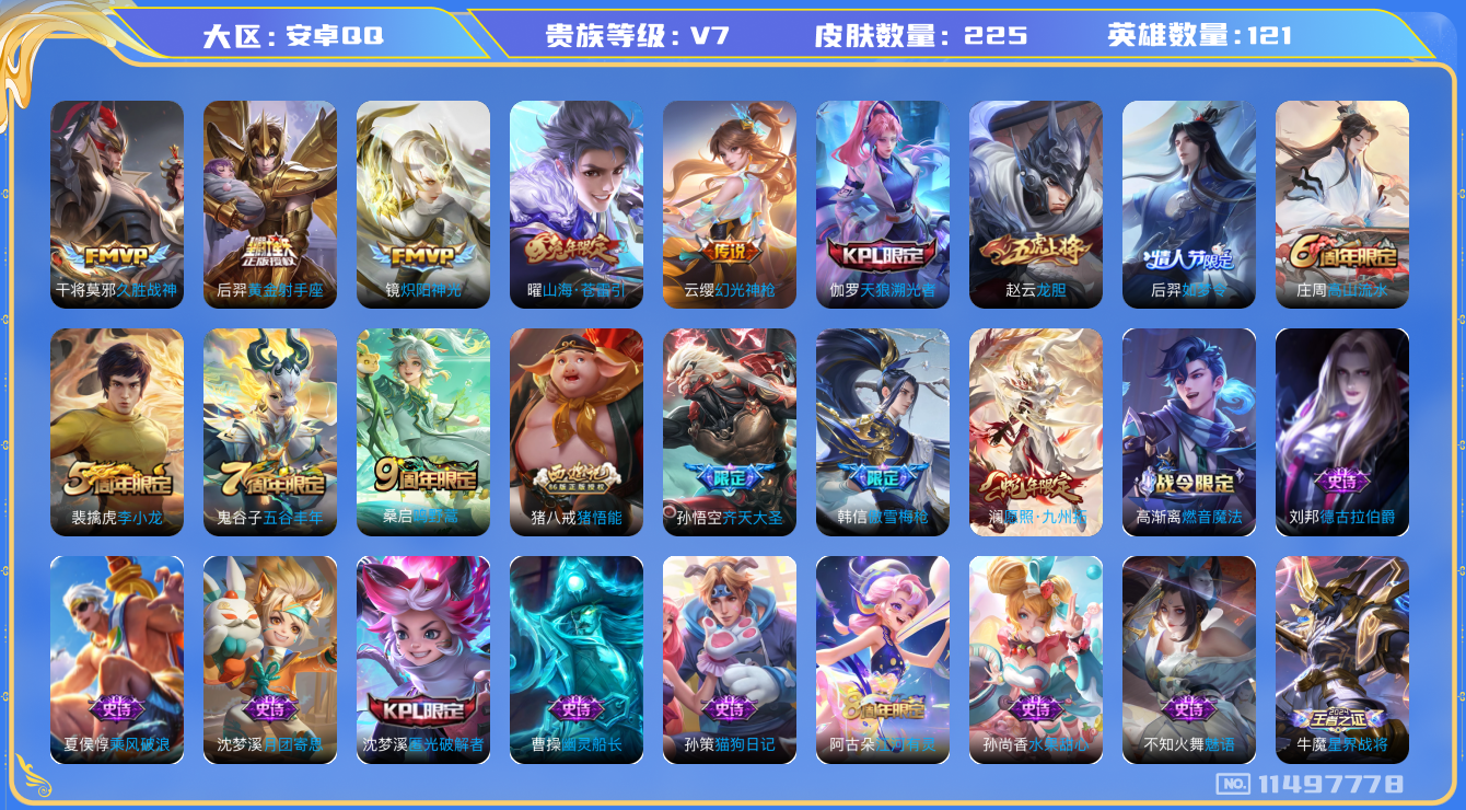 [11497778]V7 8传说 121英雄 225皮肤 可修改实名 传说皮:幻光神枪,黄金射手座,久胜战神,炽阳神光,山海·苍雷引(电光曜子) 珍宝阁皮:妄想食味,蔷薇恋人 限定皮:愿照·九州拓(澜年限),鸣野蒿,傲雪梅枪,高山流水,齐天大圣,五谷丰年,龙胆,天狼溯光者,李小龙,如梦令-后羿,猪悟能 史诗皮:星界战将,黄金分割率,特工魅影,永昼,江河有灵,高渐离燃音魔法,百解令(蒙犽),匿光破解者,蒙恬荣光圣徽,冰冠公主,偶像歌手,魅语,电玩·爆裂旋风,末日机甲-吕布,猫狗日记-孙策,修罗,女仆咖啡,水果甜心,绅士熊喵,天才门将,星夜王子,功夫厨神,德古拉伯爵,暗隐猎兽者,幽灵船长,鬼剑武藏,心灵战警,拒霜思,乘风破浪,逐浪之夏,月团寄思,水晶猎龙者,金属风暴,原初追逐者,圣诞狂欢,圣诞恋歌,鹰眼统帅,魅力维加斯,黎明之约,赏金猎手,无心,未来纪元-赵云,玫瑰异探