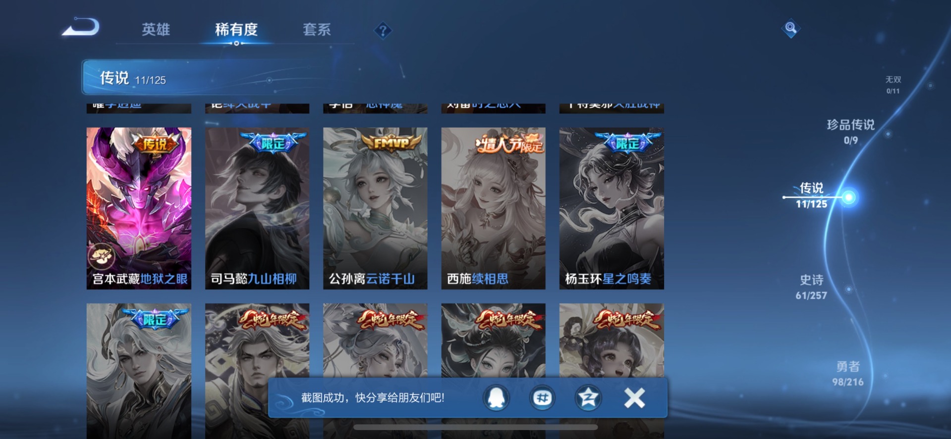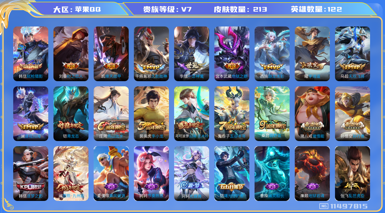 - [12029732]V7 1典藏 1无双 1珍品传说 7传说 125英雄 238皮肤 可修改实名 优质装备:鸣剑·曳影,器灵·螭龙剑,怪盗基德,久胜战神,末日机甲-孙尚香(绿蚂蚱),无双飞将,涂山容容 传说皮:幻光神枪 珍宝阁皮:万物之道,优雅恋人,女武神 限定皮:愿照·九州拓(澜年限),鸣野蒿,白晶晶,遇见飞天,高山流水,五谷丰年,武圣,游园惊梦,梁祝,御风骁将(吕布年限),李小龙,霸王别姬-虞姬,大圣娶亲,蜜橘之夏 史诗皮:鸭鸭历险记-刘禅,器灵·浮梦炉,星界战将,谪仙醉月,石田雨龙,埋骨钱,琥珀纪元伽罗,蔬乡物语(鲁班七号),百相守梦-黄忠,电玩小子(小书包),黄金分割率,特工魅影,江河有灵,百解令(蒙犽),高渐离燃音魔法,蒙恬荣光圣徽,无限星赏官,冰冠公主,偶像歌手,晚萤,龙骑士(小龙虾),末日机甲-吕布,猫狗日记-孙策,节奏热浪,修罗,水果甜心,绅士熊喵,天才门将,星夜王子,德古拉伯爵,暗隐猎兽者,幽灵船长,鬼剑武藏,心灵战警,舞动绿茵,纤云弄巧,缤纷独角兽,乘风破浪,逐浪之夏,月团寄思,水晶猎龙者,曙光守护者,金属风暴,原初追逐者,圣诞狂欢,圣诞恋歌,鹰眼统帅,魅力维加斯,黎明之约