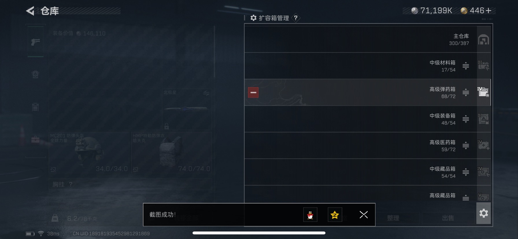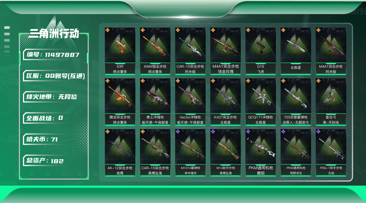 [11497887]总资产:182.8M 3干员外观 1近战传说 16传说枪械 哈夫币:71.199K 可二次 可修改实名 优质装备:近战-北极星,顶级安全箱(3x3) 烽火地带段位:无段位 全面战场段位:无段位 传说武器皮肤:AK-12突击步枪-夜鹰,G18-飞虎,M4A1突击步枪-阿米娅,CAR-15突击步枪-阿米娅,复合弓-黑-天际线,AWM狙击步枪-捞点薯条,QCQ171冲锋枪-北极星,腾龙突击步枪-捞点薯条,93R-捞点薯条,勇士冲锋枪-能天使-午夜邮差,725双管霰弹枪-送葬人-无题密令,K437突击步枪-北极星,M4A1突击步枪-蚀金玫瑰,CAR-15突击步枪-黑鹰坠落,Vector冲锋枪-能天使-午夜邮差 史诗武器皮肤:MP7冲锋枪-原型机(典藏),AUG突击步枪-蝮蛇,PKM通用机枪-蝮蛇,Ash-12战斗步枪-守夜人,SG552突击步枪-尖端治疗,SR-25射手步枪-尖端治疗,PKM通用机枪-荒野求生,MP5冲锋枪-深海恐惧,勇士冲锋枪-深海恐惧,G3战斗步枪-锡兰,SR-3M紧凑突击步枪-荒野求生,M1014霰弹枪-林中猎手,SV-98狙击步枪-林中猎手,SVD狙击步枪-荒野求生,AS Val突击步枪-典狱官,M250通用机枪-囚徒,SV-98狙击步枪-囚徒,SCAR-H战斗步枪-囚徒,PSG-1射手步枪-无垢,M14射手步枪-黑鹰坠落,QBZ95-1突击步枪-曙光,Vector冲锋枪-阿萨拉文明,SVD狙击步枪-阿萨拉工艺 干员外观:红狼-蚀金玫瑰,露娜-黑·天际线,蛊-能天使·午夜邮差